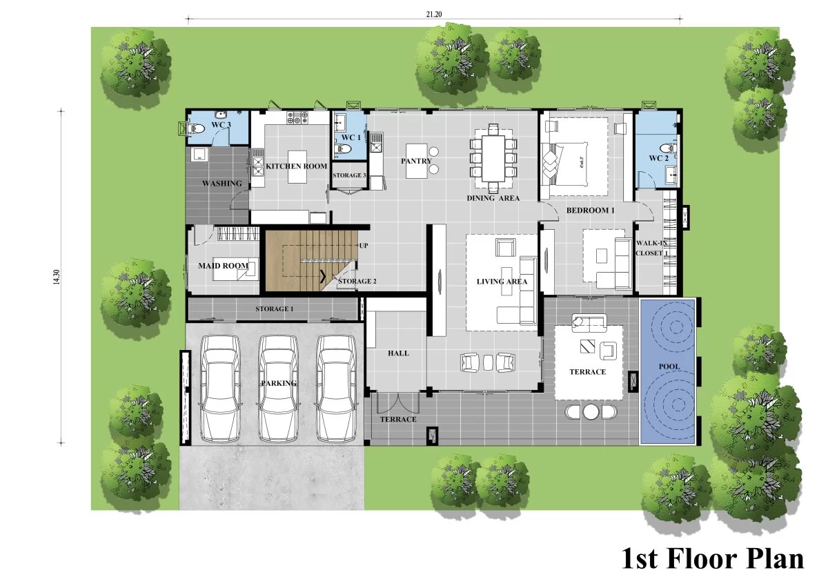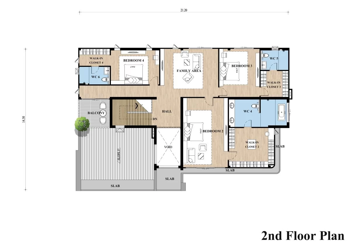 แบบบ้านหน้ากว้างสไตล์ทรอปิคอลโมเดิร์น เน้นความเรียบง่ายผสมผสานกับความทันสมัย ตกแต่งด้วยไม้สำเร็จรูปให้บรรยากาศอบอุ่น พร้อมด้วยการจัดพื้นที่ครบครันถึง 5 ห้องนอน โดยที่มีห้องนอนชั้นล่างสำหรับรองรับผู้สูงอายุในอนาคต เหมาะสำหรับครอบครัวขนาดใหญ่ ที่ต้องการให้สมาชิกในบ้านอยู่อาศัยร่วมกันในบรรยากาศอบอุ่นและการอยู่สบายของคนในครอบครัว