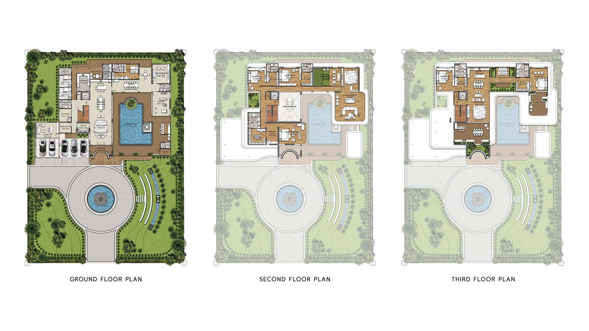 แบบบ้านสไตล์ Modern Luxury ส่วนประกอบของบ้าน ได้แก่ บ้าน 2 ชั้น 3 ห้องนอน 4 ห้องน้ำ จอดรถ 3 คัน สระว่ายน้ำ และส่วนบริการ