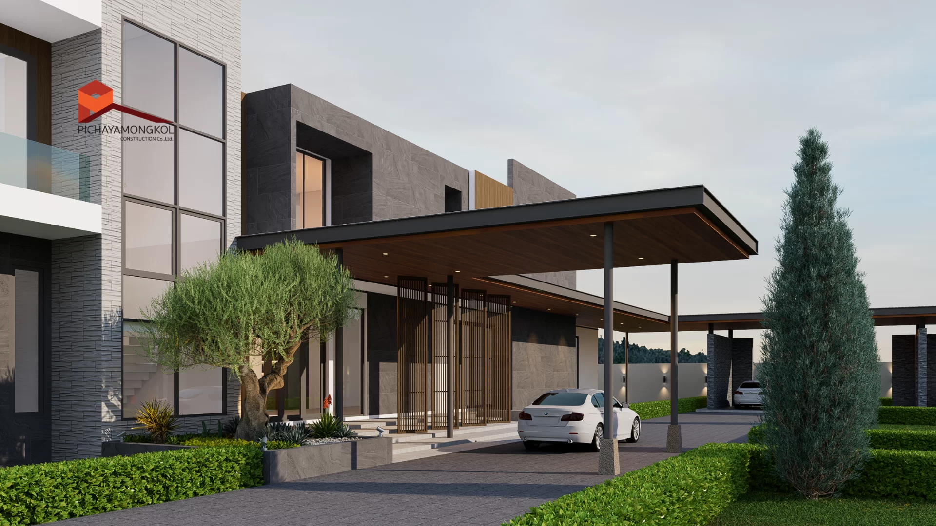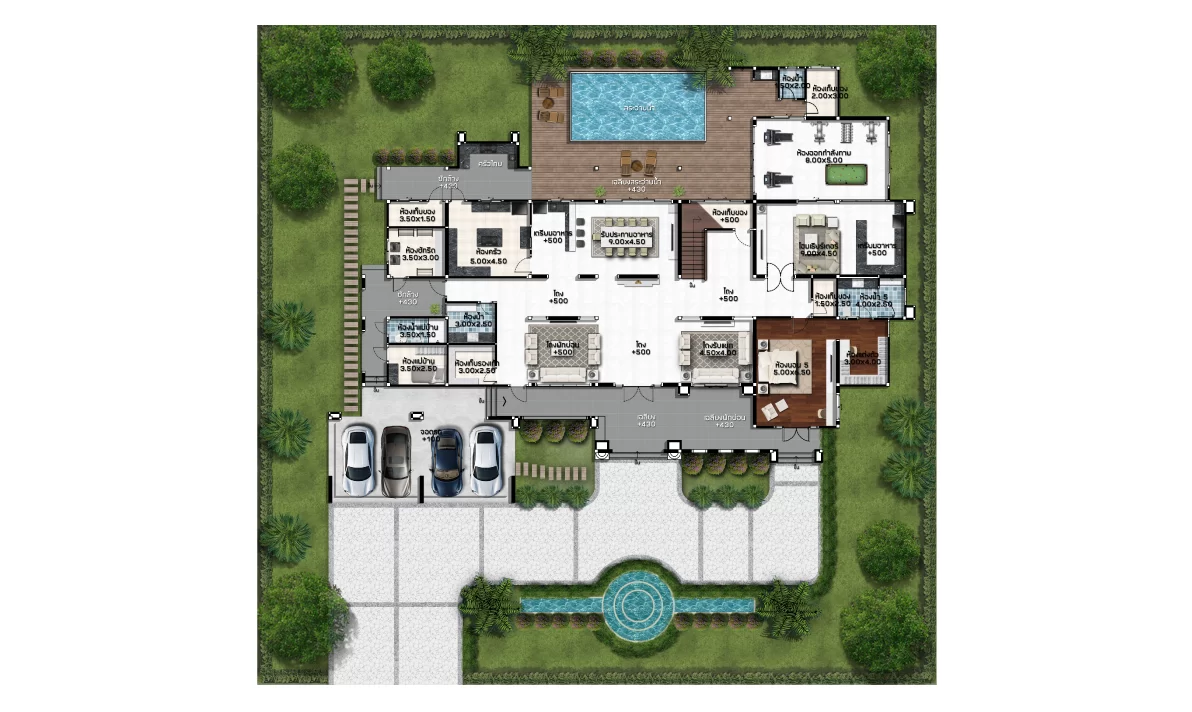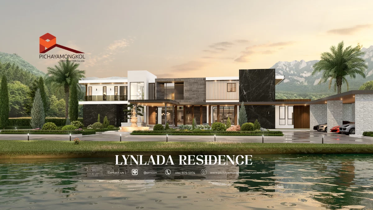 แบบบ้านสไตล์ modern tropical แนวคิดออกแบบที่มีอัตลักษณ์ผสมผสานความทันสมัยและธรรมชาติ ตอบโจทย์ครอบครัวขนาดใหญ่ด้วยพื้นที่ใช้สอยที่ออกแบบมาอย่างพิถีพิถัน การออกแบบมีการเลือกส่วนสีตัวอาคารโดยส่วนที่เน้นสร้างมิติให้อาคาร เราเลือกใช้สีเทคเจอร์และหินวีเนียร์โทนสีเทาและดำ ที่มีผิวสัมผัสเฉพาะตัว เพื่อเพิ่มความเข้มขรึมให้กับตัวอาคาร อีกทั้งยังเลือกใช้วัสดุตกแต่งตัวอาคารที่มีลวดลายคล้ายไม้ ที่เมื่อกระทบกับแสงแดดจะให้ความรู้สึกที่อบอุ่นและผ่อนคลาย รวมถึงการเลือกใช้ ( Facade ) เพื่อเพิ่มความน่าค้นหาให้กับตัวอาคาร เพื่อสะท้อนถึงการตกแต่งที่หรูหราภายในบ้าน ในส่วนของกระจกได้เลือกใช้กระจกที่สูงจรดเพดาน การแบ่งสัดส่วนภายใน มีความโปร่งสบายไม่อึดอัด แต่ยังคงมีความเป็นส่วนตัวของผู้อยู่อาศัย ฟังก์ชันการใช้สอยภายในบ้านที่มีทั้งพื้นที่ส่วนตัวและส่วนกลาง ประกอบด้วย 7 ห้องนอน 8 ห้องน้ำ 4 ห้องอเนกประสงค์ 1 สระว่ายน้ำ และ ระเบียงขนาดใหญ่ บริเวณชั้น 2 ที่รองรับกิจกรรมต่าง ๆ ได้อย่างหลากหลาย เหมาะกับการทำกิจกรรมภายในครอบครัวหรือจะชวนเพื่อน ๆ มาสังสรรค์ในช่วงเทศกาลต่าง ๆ บ้านหลังนี้จึงตอบโจทย์ความต้องการของสมาชิกในครอบครัวทุกช่วงวัย