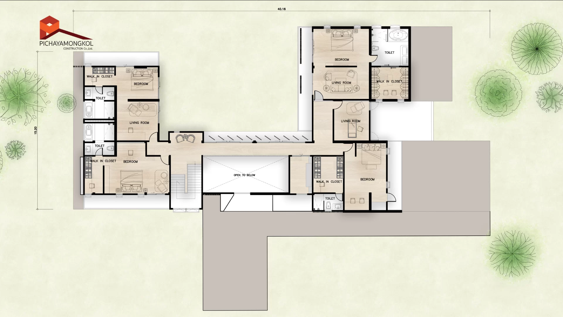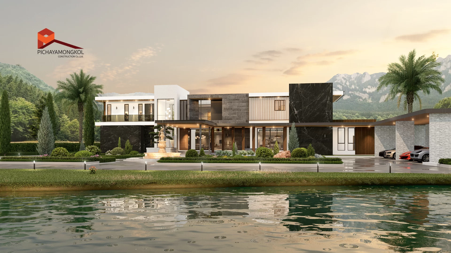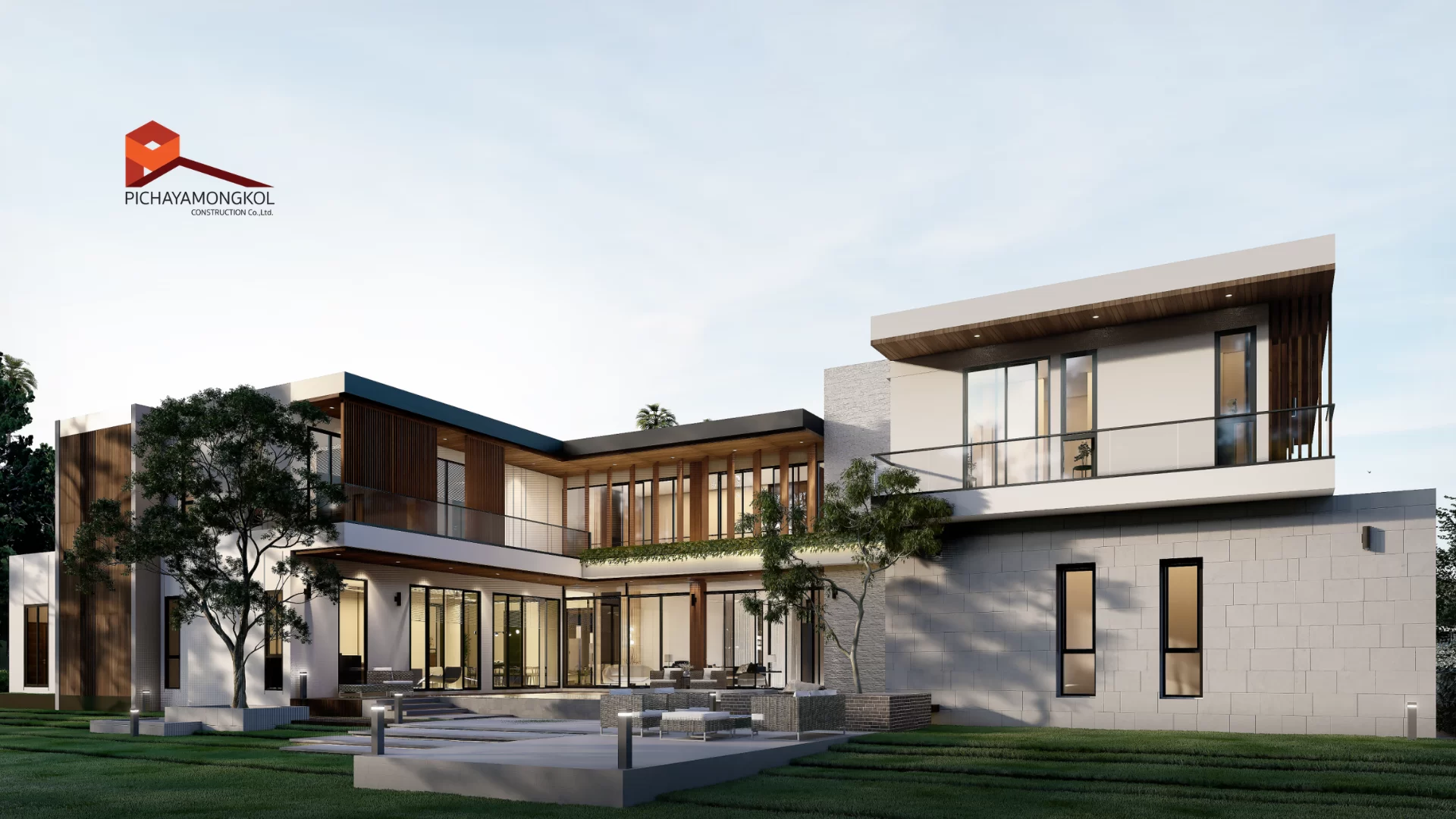 แบบบ้านสไตล์ modern tropical แนวคิดออกแบบที่มีอัตลักษณ์ผสมผสานความทันสมัยและธรรมชาติ ตอบโจทย์ครอบครัวขนาดใหญ่ด้วยพื้นที่ใช้สอยที่ออกแบบมาอย่างพิถีพิถัน การออกแบบมีการเลือกส่วนสีตัวอาคารโดยส่วนที่เน้นสร้างมิติให้อาคาร เราเลือกใช้สีเทคเจอร์และหินวีเนียร์โทนสีเทาและดำ ที่มีผิวสัมผัสเฉพาะตัว เพื่อเพิ่มความเข้มขรึมให้กับตัวอาคาร อีกทั้งยังเลือกใช้วัสดุตกแต่งตัวอาคารที่มีลวดลายคล้ายไม้ ที่เมื่อกระทบกับแสงแดดจะให้ความรู้สึกที่อบอุ่นและผ่อนคลาย รวมถึงการเลือกใช้ ( Facade ) เพื่อเพิ่มความน่าค้นหาให้กับตัวอาคาร เพื่อสะท้อนถึงการตกแต่งที่หรูหราภายในบ้าน ในส่วนของกระจกได้เลือกใช้กระจกที่สูงจรดเพดาน การแบ่งสัดส่วนภายใน มีความโปร่งสบายไม่อึดอัด แต่ยังคงมีความเป็นส่วนตัวของผู้อยู่อาศัย ฟังก์ชันการใช้สอยภายในบ้านที่มีทั้งพื้นที่ส่วนตัวและส่วนกลาง ประกอบด้วย 7 ห้องนอน 8 ห้องน้ำ 4 ห้องอเนกประสงค์ 1 สระว่ายน้ำ และ ระเบียงขนาดใหญ่ บริเวณชั้น 2 ที่รองรับกิจกรรมต่าง ๆ ได้อย่างหลากหลาย เหมาะกับการทำกิจกรรมภายในครอบครัวหรือจะชวนเพื่อน ๆ มาสังสรรค์ในช่วงเทศกาลต่าง ๆ บ้านหลังนี้จึงตอบโจทย์ความต้องการของสมาชิกในครอบครัวทุกช่วงวัย