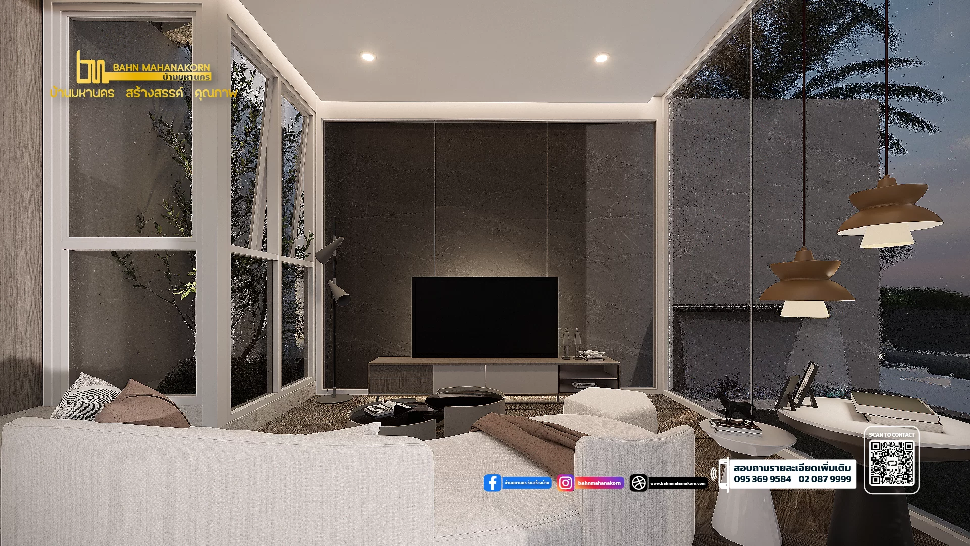 แบบบ้านสวย ทันสมัย สไตล์ Modern-Contemporary เป็นแบบบ้าน Multifamily สำหรับผู้ต้องการสร้างบ้านสำหรับสมาชิกหลายครอบครัว ด้วยการออกแบบกลุ่มอาคารที่เชื่อมกัน ด้วยการจัดพื้นที่ใช้สอยดูเป็นหลังเดียวอย่างอบอุ่นด้วยพื้นที่ใช้สอยขนาดใหญ่ จัดวางตำแหน่งห้องได้อย่างลงตัว ส่วนพักผ่อนบริเวณสระว่ายน้ำพร้อมเฉลียงกว้างขวาง ให้ทุกคนในครอบครัวทำกิจกรรมร่วมกันได้อย่างมีความสุข ประตู-หน้าต่างอลูมิเนียมสีดำเพิ่มความทันสมัย ตอบโจทย์แบบบ้านสำหรับคนรุ่นใหม่ กระจกโถงรับแขก Double Space ดูโอ่โถง เปิดรับแสงได้เต็มที่ ช่วยประหยัดพลังงาน