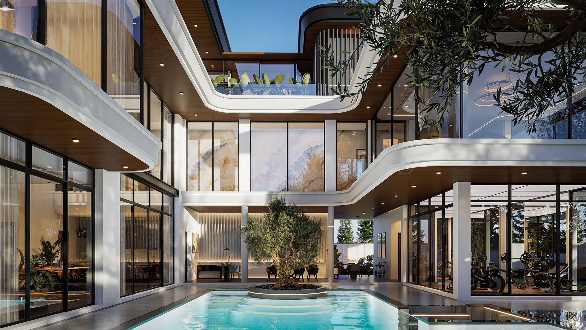บ้านที่ได้แรงบันดาลใจมาจาก Resort & Spa! เน้นคอนเซ็ปต์ของการจัดสัดส่วนอย่างลงตัวระหว่างการพักผ่อนและการทำกิจกรรม สะท้อนการดีไซน์แบบ function to Form ของอาคาร ที่ตอบโจทย์ทั้งการใช้ชีวิตและสุนทรียภาพของสถาปัตยกรรม โดยบ้านหลังนี้ออกแบบส่วนตรงกลางเป็น Courtyard เปิดโล่ง รูปตัว U เป็นพื้นที่สระว่ายน้ำและเฉลียงขนาดใหญ่เป็นจุดพักผ่อนหลักของบ้าน ที่สามารถเชื่อมต่อพื้น Flow of Space) ไปยัง Dining และ Living area ได้ และมีส่วนของ Salon & Gym ที่มองออกมาเห็นวิวสระว่ายน้ำและสวนกลางบ้านเพิ่มความผ่อนคลาย และเชื่อมต่อพื้นที่ชั้นสองด้วยโถงสูงเปิดโล่งและบันไดทอดยาวไปยังห้องพักผ่อนส่วนกลางของครอบครัว ก่อนจะนำทางไปยังห้องนอนส่วนตัวของแต่ละคน ฟอร์มของอาคารใช้การคว้านและยื่นตัวกล่องอาคารเพื่อการเว้นจังหวะของสัดส่วนอาคาร และใช้ Facade อิฐบล็อกเรียงตัวสลับกันเป็นการบดบังสายตาและเปิดมุมมองส่วนระเบียง และระแนงไม้ที่ยาวบดบังทางเดินและส่วนกลางของบ้าน เพิ่มความเป็นส่วนตัวมากขึ้นด้วยการจัดสวนหน้าบ้าน ทั้งยังได้ลมเย็นเข้าสูตัวอาคารอีกด้วย