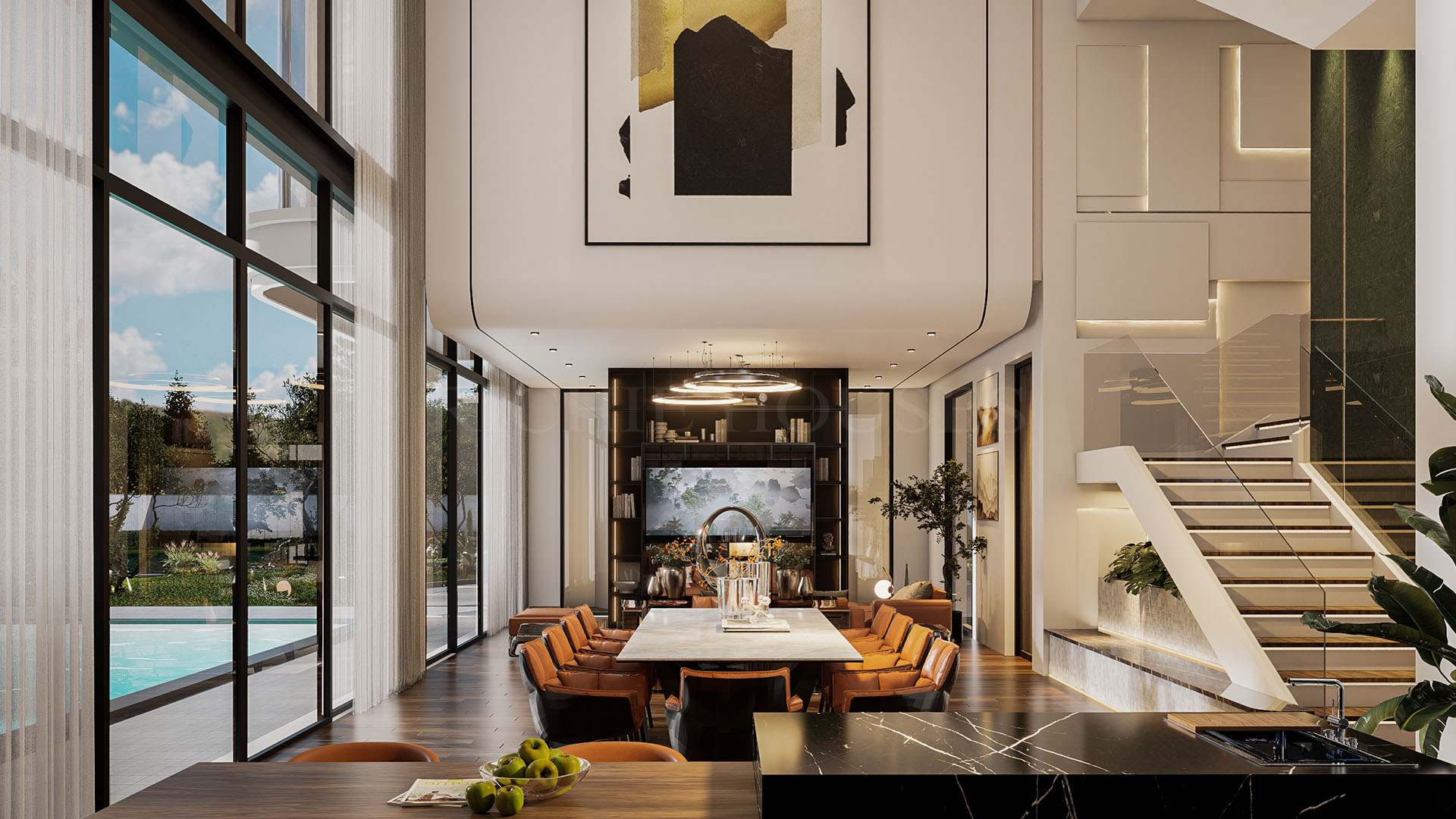 บ้านสองชั้นสไตล์ โมเดิร์นหรูหรา ที่ออกแบบให้ตอบโจทย์ทั้งความสวยงามและฟังก์ชันการใช้งานอย่างลงตัว เหมาะสำหรับครอบครัวยุคใหม่ที่ต้องการบ้านที่สะท้อนรสนิยมและคุณภาพชีวิตที่เหนือระดับ ใช้โทนสีเข้มตัดกับลายหินและไม้ธรรมชาติ สร้างบรรยากาศที่ดูเท่และมีเอกลักษณ์ โครงสร้างเน้นความโปร่งโล่ง และเสริมความทันสมัยด้วยกระจกบานใหญ่ เชื่อมต่อพื้นที่ภายในกับเฉลียงพักผ่อนและสระว่ายน้ำได้อย่างลงตัว