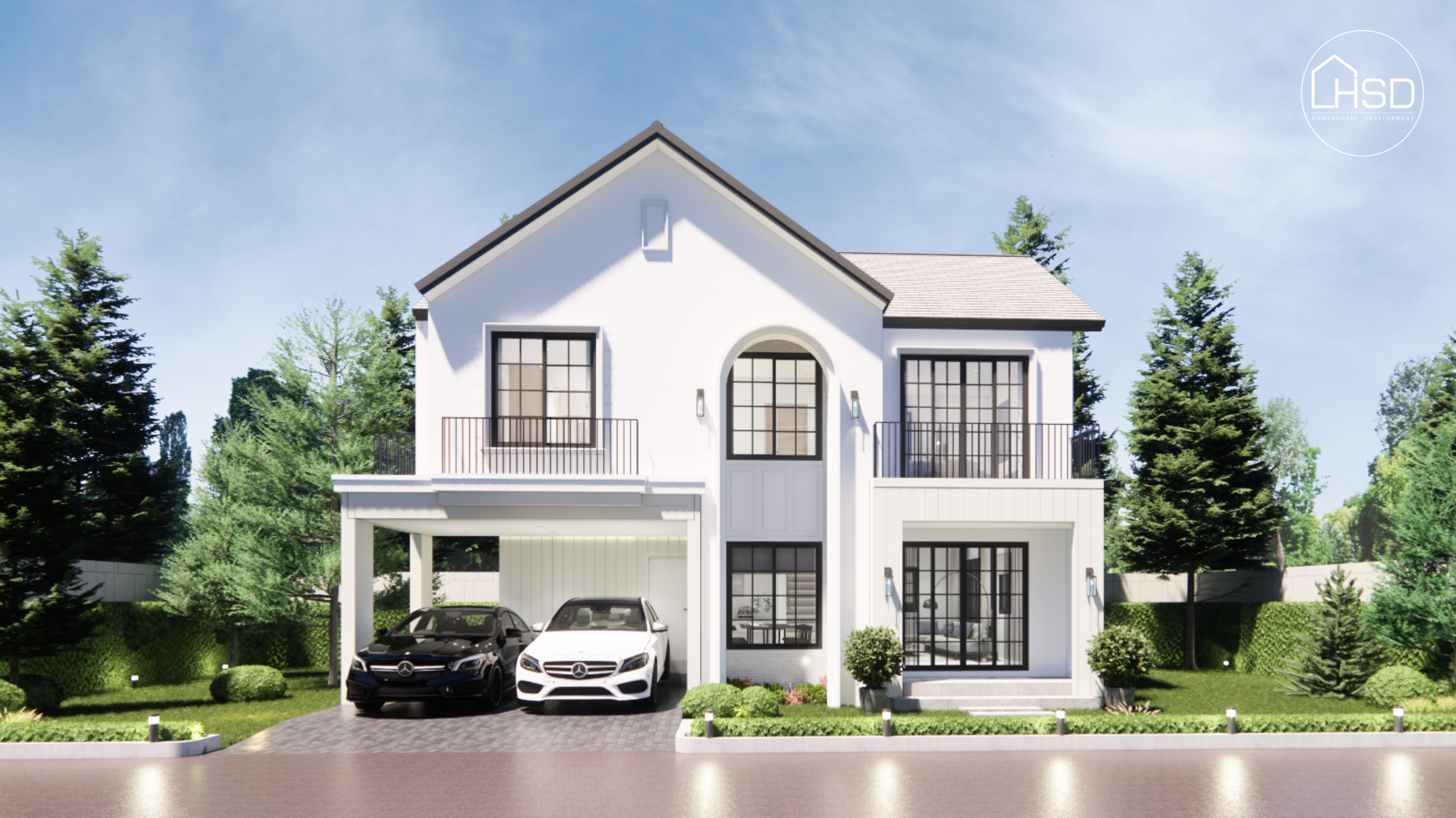 ออกแบบด้วยสไตล์ European ที่สง่างาม พิเศษด้วยโถงทางเข้าสูงโปร่ง รูปทรงบ้านโอบล้อมด้านหลังทำให้เกิด Back Yard ที่เชื่อมทุกมุมมองภายในบ้าน ผ่านหน้าต่างและประตูทรงสูงโดยมีรายละเอียดของ