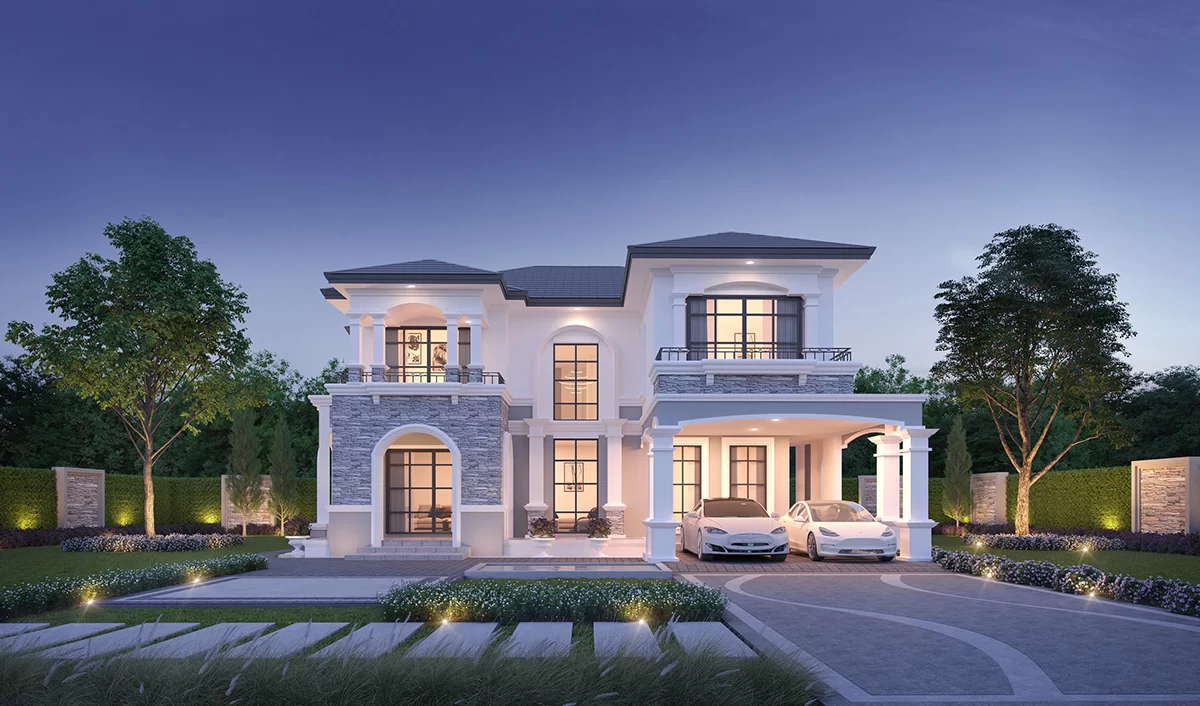 แบบบ้านคฤหาสน์สุดหรู 2 ชั้น สไตล์ Modern Classic ที่มีการตกแต่งบ้านด้วยเสน่ห์ของกลิ่นอายตะวันตก เป็นแบบบ้านหน้ากว้าง ใช้โทนสีขาวสว่างทั้งหลัง แสดงถึงความเรียบหรู มั่นคง สบายตา โดดเด่นด้วยซุ้มประตูทางเข้าที่ออกแบบในสไตล์ Modern Classic สูงตระหง่านตัดด้วยขอบกระจกสีดาเพิ่มเสน่ห์ของความ Luxury ได้อย่างมีระดับ ทั้งยังประดับด้วยกระจกบานยาวตลอดแนว เพิ่มแสงสว่าง อบอุ่น และระบายอากาศได้รอบตัวบ้าน ภายในบ้านมีการเชื่อมต่อของ Space อย่างโอ่อ่าและกว้างขวาง ทั้งชั้น 1 และชั้น 2 ออกแบบห้องนอนแบบ Master Bedroom ให้สวยมีสไตล์และพร้อมสาหรับการใช้งานอย่างแท้จริง ทั้งยังออกแบบทุกห้องด้วยความทันสมัยและความเรียบหรูมีระดับในทุกพื้นที่ใช้สอย ทาให้บ้านหลังนี้สวยอย่างทรงคุณค่าทุกยุคสมัย
