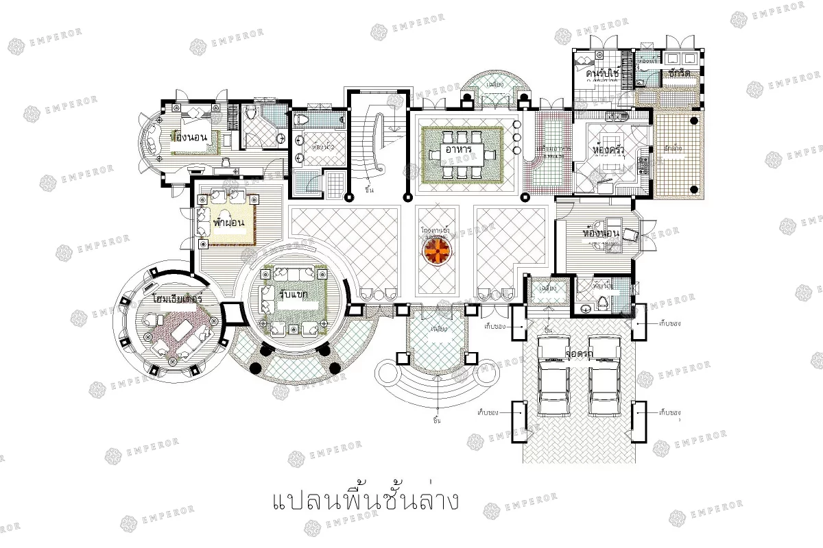 ผนังซุ้มโค้งด้านหน้า ประกอบกับหน้าบันที่ดูสง่างาม และโดมที่ยิ่งทำให้ดูโดดเด่น บริเวณโถงใหญ่ด้านหน้าที่เป็นผนังซุ้มโค้ง แสงสมารถส่องผ่าน ทำให้บ้านดูโปร่งโล่งสบาย ตอบรับกับบันไดโค้งที่ทอดยาวขึ้นสู่ชั้นบน ได้อย่างสวยงามลงตัว ฟังก์ชันการใช้งานภายในบ้านครบครัน ตอบโจทย์การอยู่อาศัยแบบครอบครัวใหญ่ ด้วยห้องนอน 4 ห้อง และยังคำนึงถึงห้องนอนสำหรับผู้สูงอายุ ห้องทานอาหารขนาดใหญ่ที่สามารถรองรับการจัดงานเลี้ยงต่างๆ และห้องสำหรับรับรองแขกมีพื้นที่และระเบียงสำหรับนั่งเล่น ให้ผู้อยู่อาศัยได้พักผ่อน