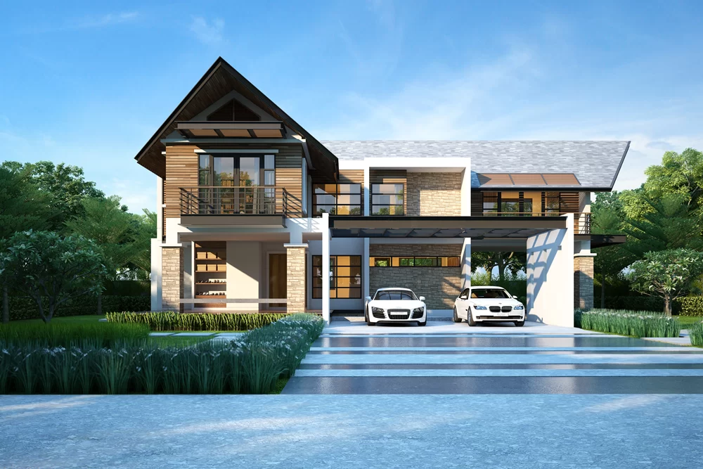 บ้านสองชั้นสไตล์ โมเดิร์นหรูหรา ที่ออกแบบให้ตอบโจทย์ทั้งความสวยงามและฟังก์ชันการใช้งานอย่างลงตัว เหมาะสำหรับครอบครัวยุคใหม่ที่ต้องการบ้านที่สะท้อนรสนิยมและคุณภาพชีวิตที่เหนือระดับ ใช้โทนสีเข้มตัดกับลายหินและไม้ธรรมชาติ สร้างบรรยากาศที่ดูเท่และมีเอกลักษณ์ โครงสร้างเน้นความโปร่งโล่ง และเสริมความทันสมัยด้วยกระจกบานใหญ่ เชื่อมต่อพื้นที่ภายในกับเฉลียงพักผ่อนและสระว่ายน้ำได้อย่างลงตัว