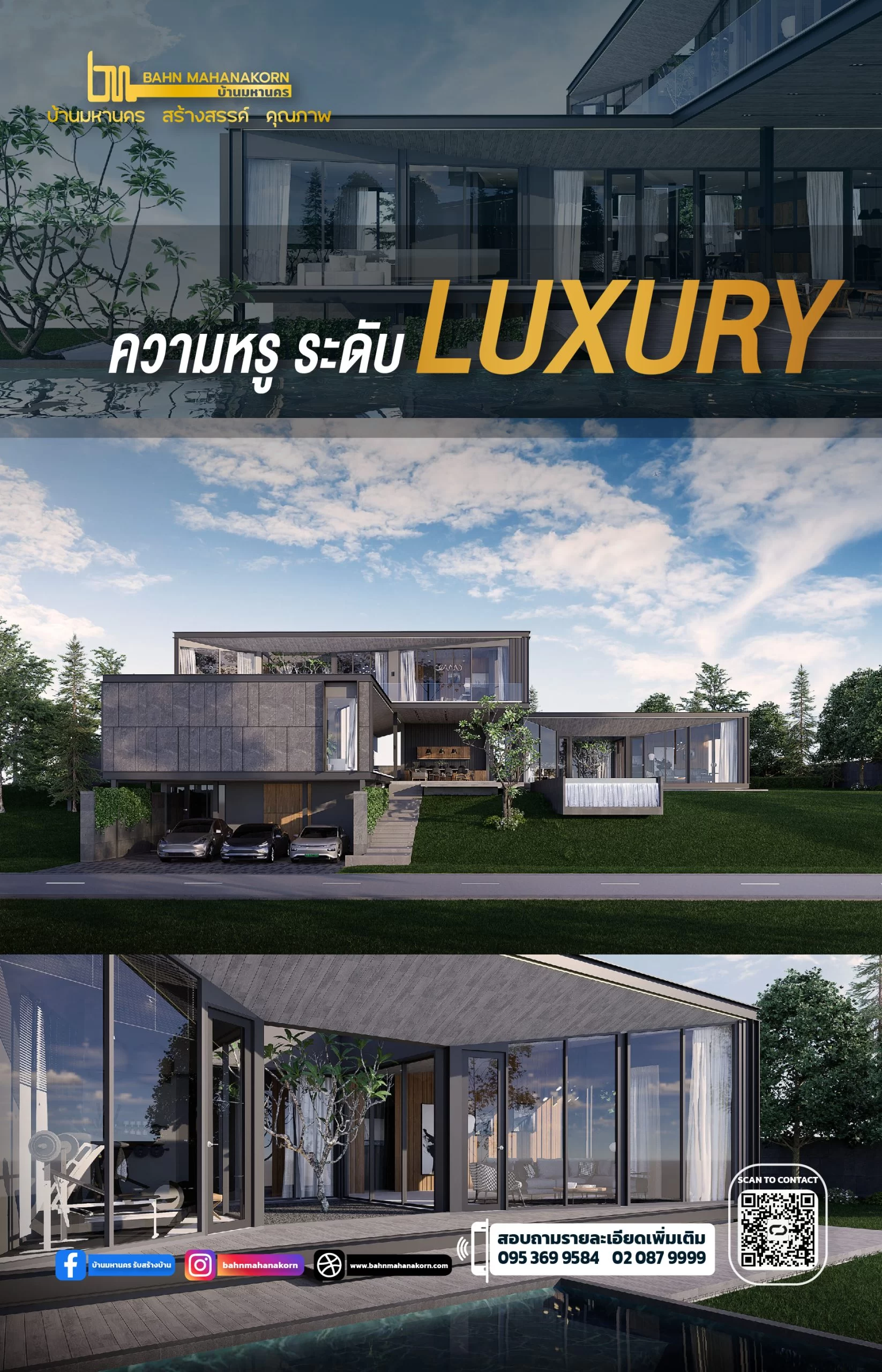 แบบบ้านสไตล์ Modern Luxury ส่วนประกอบของบ้าน ได้แก่ บ้าน 2 ชั้น 3 ห้องนอน 4 ห้องน้ำ จอดรถ 3 คัน สระว่ายน้ำ และส่วนบริการ