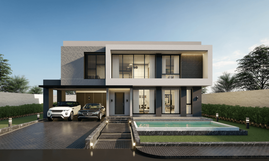แบบบ้านสไตล์ Modern Luxury ส่วนประกอบของบ้าน ได้แก่ บ้าน 2 ชั้น 2 ห้องนอน 3 ห้องน้ำ จอดรถ 2 คัน สระว่ายน้ำ และส่วนบริการ