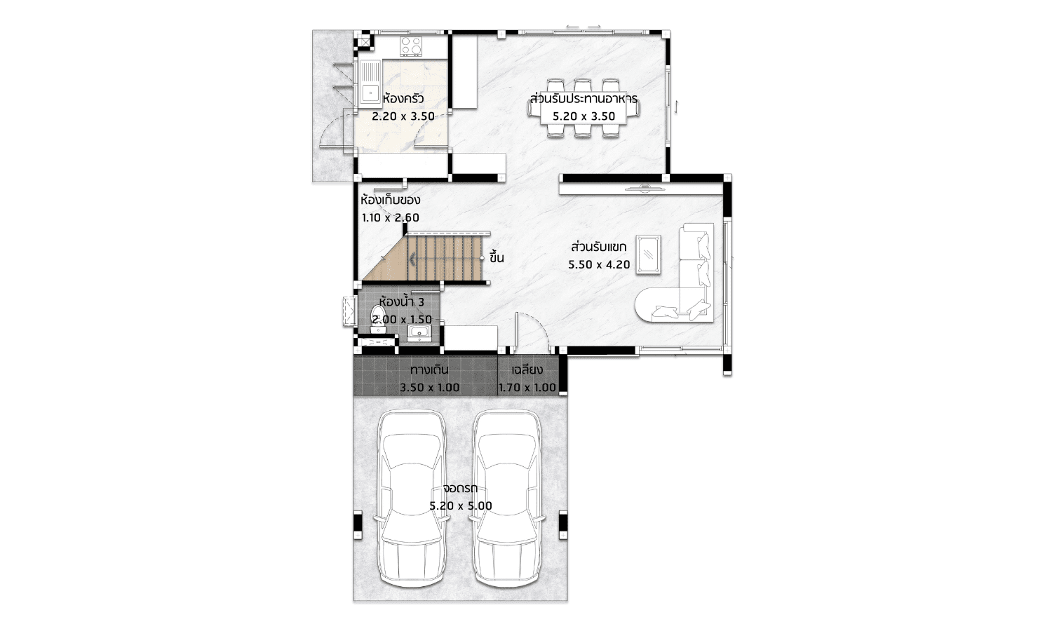 บ้านสไตล์โมเดิร์น 2 ชั้น ตอบสนองไลฟ์สไตล์ชีวิตสมัยใหม่ ด้วยส่วนพักผ่อนเชื่อมต่อกับส่วนรับประทานอาหารเพื่อให้ได้พื้นที่เปิดโล่งขนาดใหญ่สามารถที่จะปรับเปลี่ยนการใช้งานพื้นที่ได้อเนกประสงค์ยิ่งขึ้น ภายในให้ความรู้สึกโปร่งสบายด้วยกระจกบานสูงและเพดานสูง พร้อมด้วยการจัดสรรพื้นที่สำหรับห้องนอนขนาดใหญ่ 2 ห้อง และห้องพักแขกชั้นล่าง 1 ห้อง