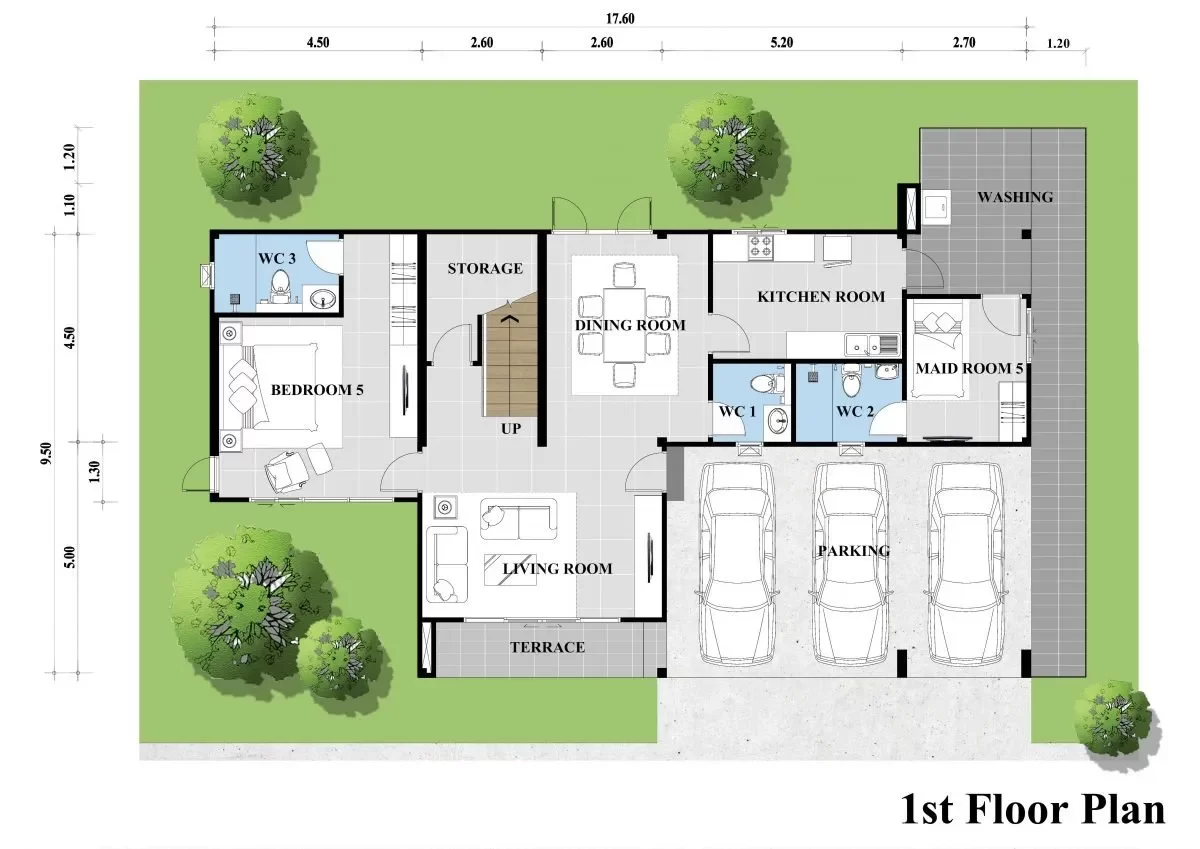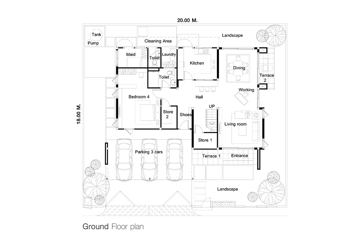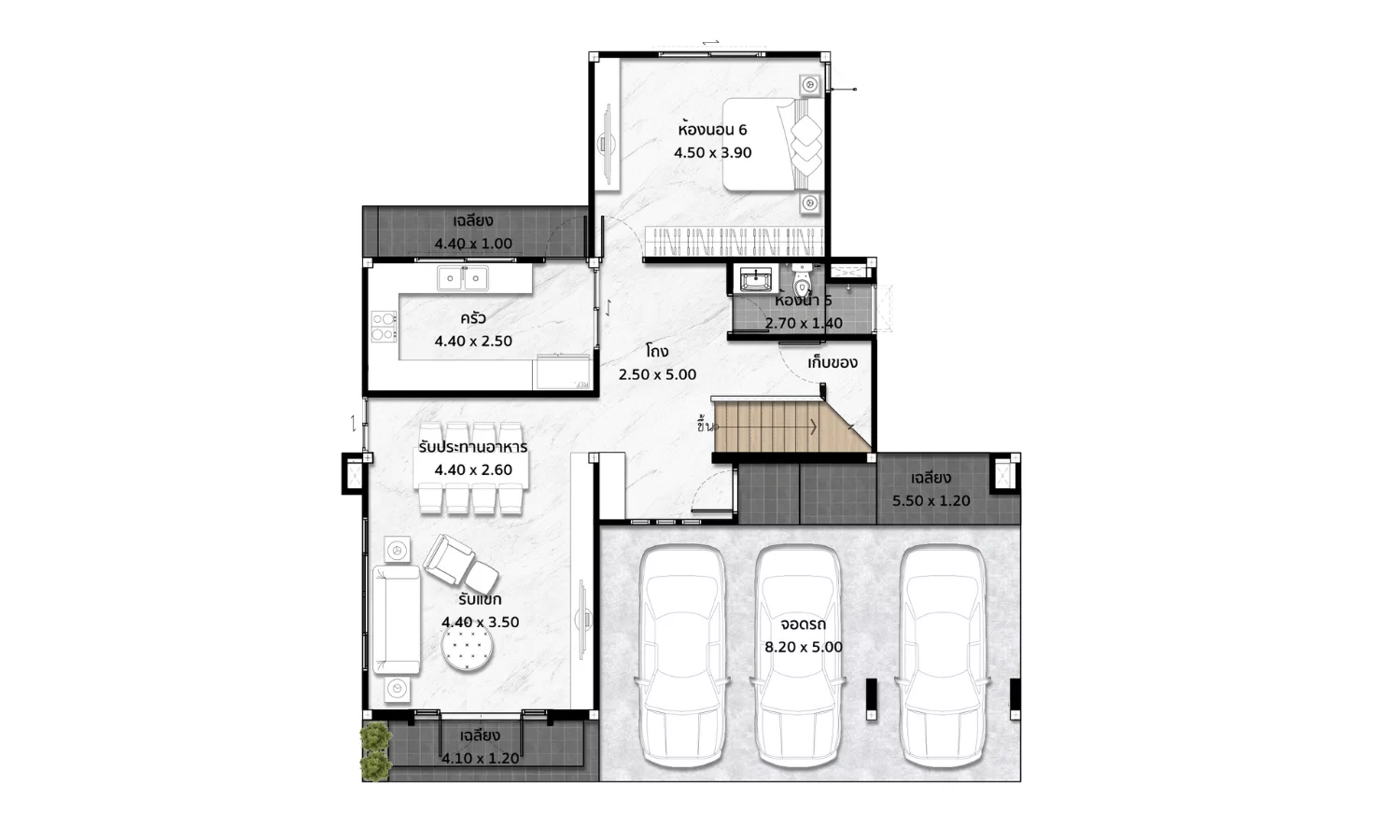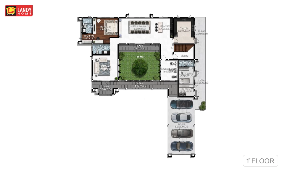 แบบบ้าน Modern Style 3 ชั้น มีความทันสมัย แต่ยังคงความเรียบง่าย ตอบสนอง Lifestyle ชีวิตสมัยใหม่ ด้วยส่วนห้องนั่งเล่นและส่วนห้องรับประทานอาหาร ที่ถูกออกแบบให้เชื่อมต่อกับพื้นที่จัดสวนตรงกลางบ้าน และมีห้องรับประทานชั้นบนสุด ที่สามารถเปลี่ยนเป็นพื้นที่พบปะสังสรรค์ได้อีกด้วย พร้อมทั้งมีห้องนอนชั้นล่างสำหรับรองรับผู้สูงอายุ หรือครอบครัวขยายในอนาคต