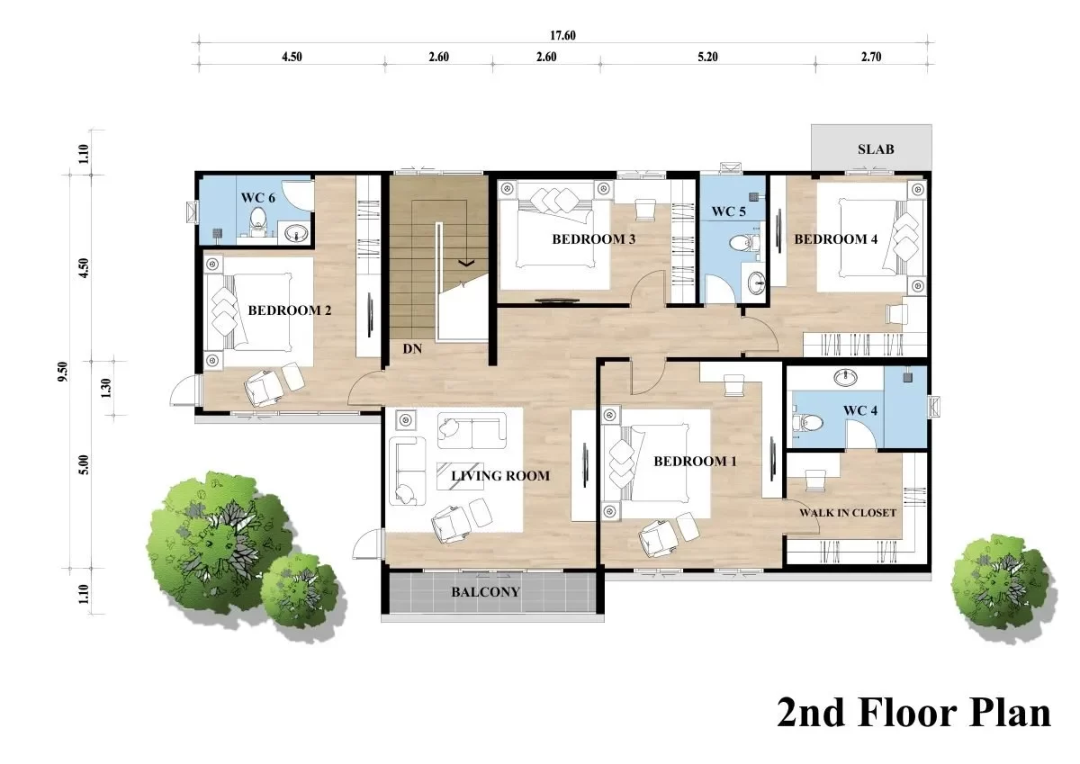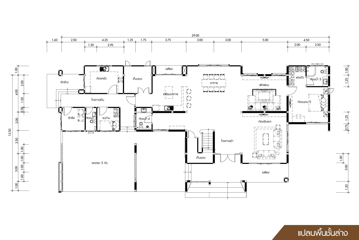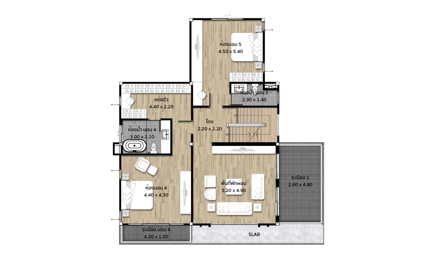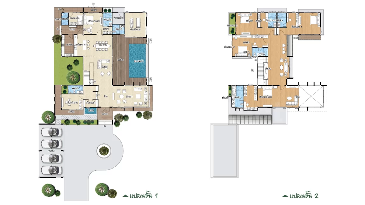 แบบบ้านหน้ากว้างสไตล์ทรอปิคอลโมเดิร์น เน้นความเรียบง่ายผสมผสานกับความทันสมัย ตกแต่งด้วยไม้สำเร็จรูปให้บรรยากาศอบอุ่น พร้อมด้วยการจัดพื้นที่ครบครันถึง 5 ห้องนอน โดยที่มีห้องนอนชั้นล่างสำหรับรองรับผู้สูงอายุในอนาคต เหมาะสำหรับครอบครัวขนาดใหญ่ ที่ต้องการให้สมาชิกในบ้านอยู่อาศัยร่วมกันในบรรยากาศอบอุ่นและการอยู่สบายของคนในครอบครัว