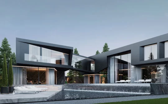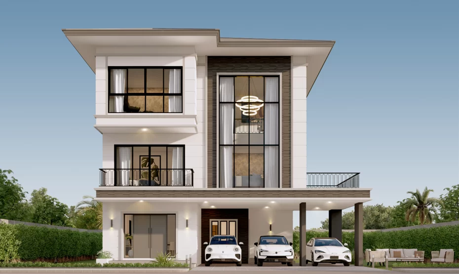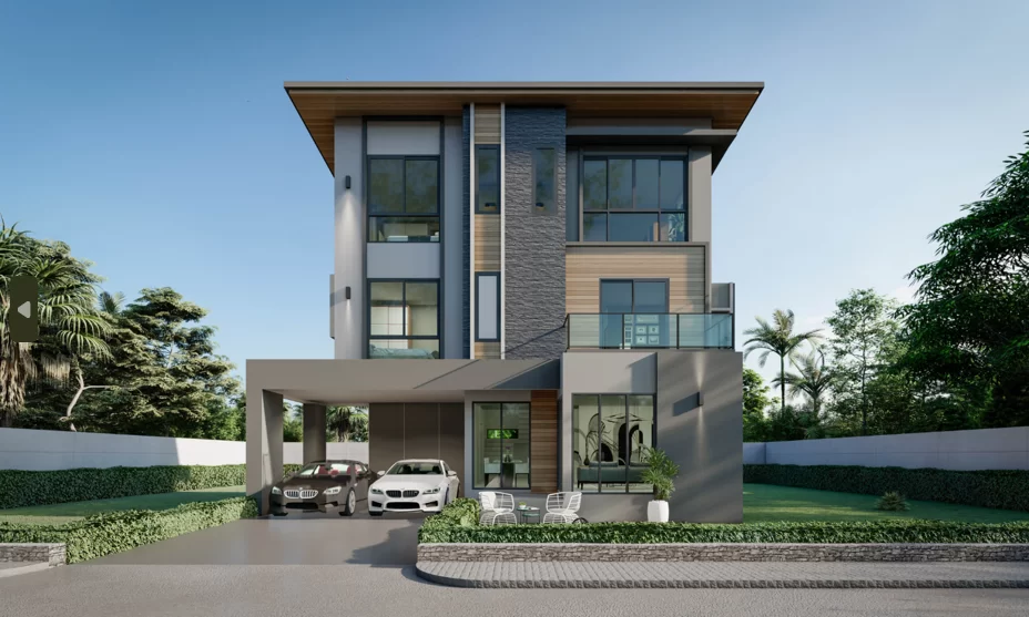 บ้านสองชั้นสไตล์ โมเดิร์นหรูหรา ที่ออกแบบให้ตอบโจทย์ทั้งความสวยงามและฟังก์ชันการใช้งานอย่างลงตัว เหมาะสำหรับครอบครัวยุคใหม่ที่ต้องการบ้านที่สะท้อนรสนิยมและคุณภาพชีวิตที่เหนือระดับ ใช้โทนสีเข้มตัดกับลายหินและไม้ธรรมชาติ สร้างบรรยากาศที่ดูเท่และมีเอกลักษณ์ โครงสร้างเน้นความโปร่งโล่ง และเสริมความทันสมัยด้วยกระจกบานใหญ่ เชื่อมต่อพื้นที่ภายในกับเฉลียงพักผ่อนและสระว่ายน้ำได้อย่างลงตัว