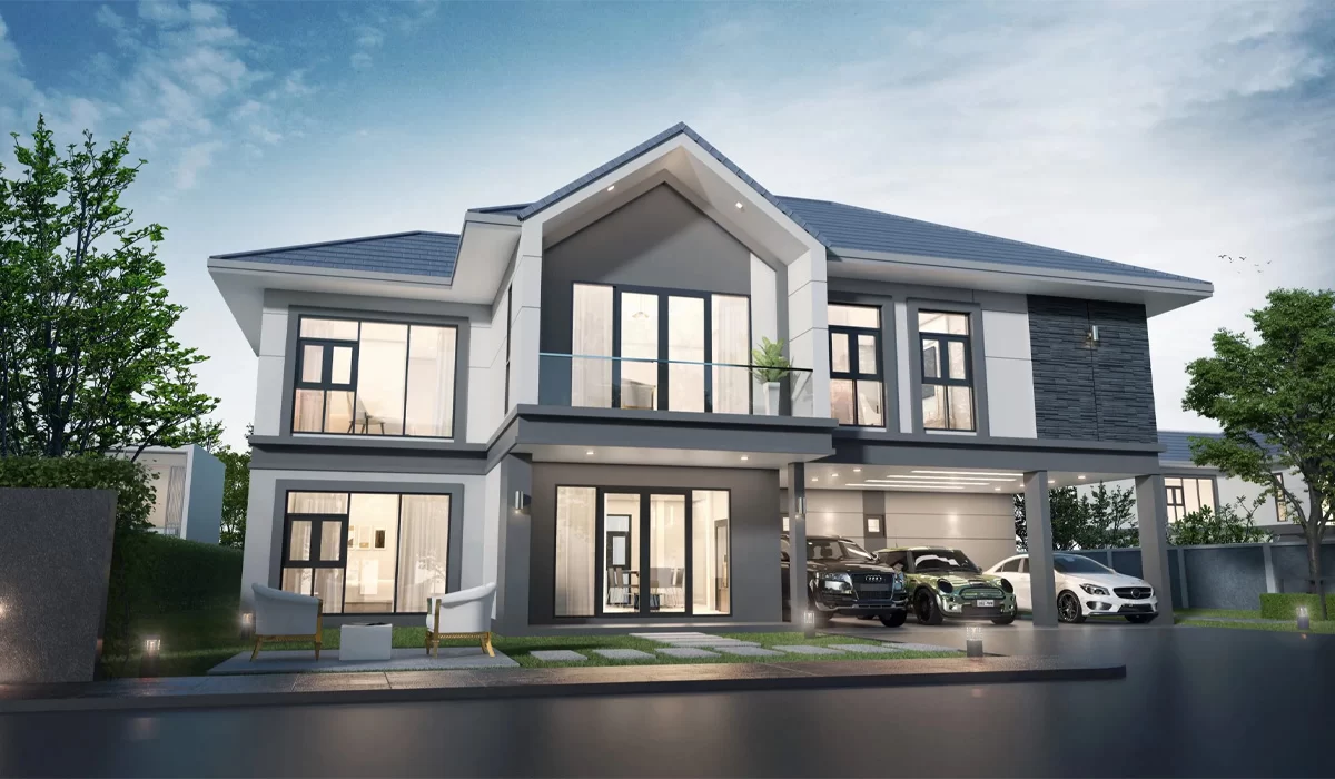 อีกมิติของแบบบ้านโมเดิร์น ที่มีเอกลักษณ์โดดเด่นทันสมัย ด้วยรูปทรงที่เรียบหรู สง่างาม พิถีพิถัน ตกแต่งด้วยอลูมิเนียมฉลุลาย สีพิงค์โกล์ด เพิ่มมุมมองให้กับตัวบ้านที่แปลกตา สวยเก๋ ดูดีมีสไตล์ เหมาะกับรสนิยม (LIFE STYLE) ของคนรุ่นใหม่ ความโอ่โถง ซุ้มทางเข้าโปร่งโล่ง DOUBLE VOLUMN ที่เชื่อมด้วยซุ้มทางเดิน (WALK WAY) จากโรงรถและเพิ่มสเน่ห์ของบ้านด้วยมุมทำงานกลางสวนหน้าบ้าน เป็นสัดส่วนสำหรับแขกพิเศษ อีกทั้ง FUNCTION ที่ครบครัน ด้วยความน่าสนใจของเฉลียงพักผ่อนหลังบ้านที่มีหลังคาคลุมโปร่งโล่ง ทำให้สมาชิกครอบครัวทุกวัยทำกิจกรรมด้วยกันอย่างลงตัว