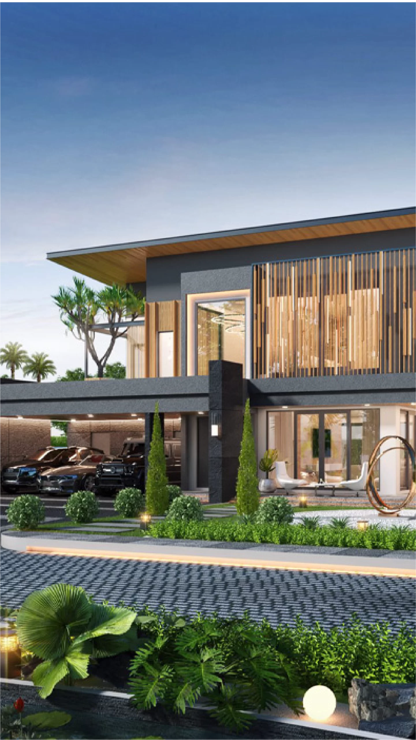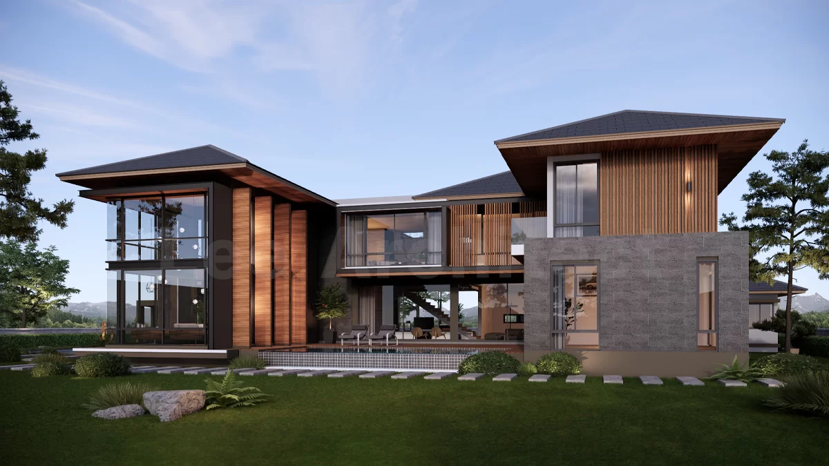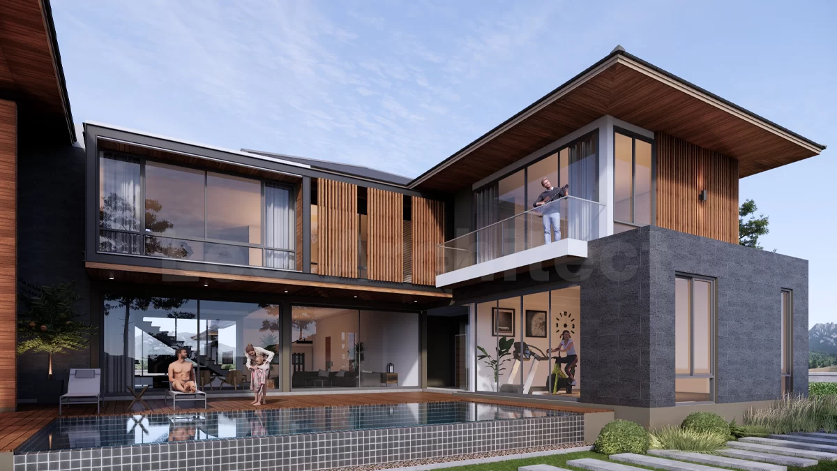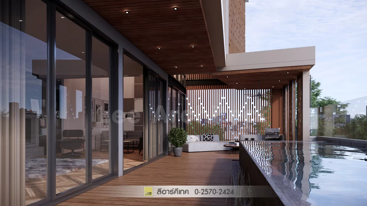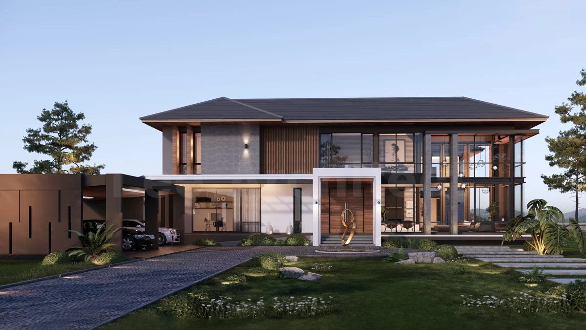 แบบบ้านสไตล์ modern tropical แนวคิดออกแบบที่มีอัตลักษณ์ผสมผสานความทันสมัยและธรรมชาติ ตอบโจทย์ครอบครัวขนาดใหญ่ด้วยพื้นที่ใช้สอยที่ออกแบบมาอย่างพิถีพิถัน การออกแบบมีการเลือกส่วนสีตัวอาคารโดยส่วนที่เน้นสร้างมิติให้อาคาร เราเลือกใช้สีเทคเจอร์และหินวีเนียร์โทนสีเทาและดำ ที่มีผิวสัมผัสเฉพาะตัว เพื่อเพิ่มความเข้มขรึมให้กับตัวอาคาร อีกทั้งยังเลือกใช้วัสดุตกแต่งตัวอาคารที่มีลวดลายคล้ายไม้ ที่เมื่อกระทบกับแสงแดดจะให้ความรู้สึกที่อบอุ่นและผ่อนคลาย รวมถึงการเลือกใช้ ( Facade ) เพื่อเพิ่มความน่าค้นหาให้กับตัวอาคาร เพื่อสะท้อนถึงการตกแต่งที่หรูหราภายในบ้าน ในส่วนของกระจกได้เลือกใช้กระจกที่สูงจรดเพดาน การแบ่งสัดส่วนภายใน มีความโปร่งสบายไม่อึดอัด แต่ยังคงมีความเป็นส่วนตัวของผู้อยู่อาศัย ฟังก์ชันการใช้สอยภายในบ้านที่มีทั้งพื้นที่ส่วนตัวและส่วนกลาง ประกอบด้วย 7 ห้องนอน 8 ห้องน้ำ 4 ห้องอเนกประสงค์ 1 สระว่ายน้ำ และ ระเบียงขนาดใหญ่ บริเวณชั้น 2 ที่รองรับกิจกรรมต่าง ๆ ได้อย่างหลากหลาย เหมาะกับการทำกิจกรรมภายในครอบครัวหรือจะชวนเพื่อน ๆ มาสังสรรค์ในช่วงเทศกาลต่าง ๆ บ้านหลังนี้จึงตอบโจทย์ความต้องการของสมาชิกในครอบครัวทุกช่วงวัย