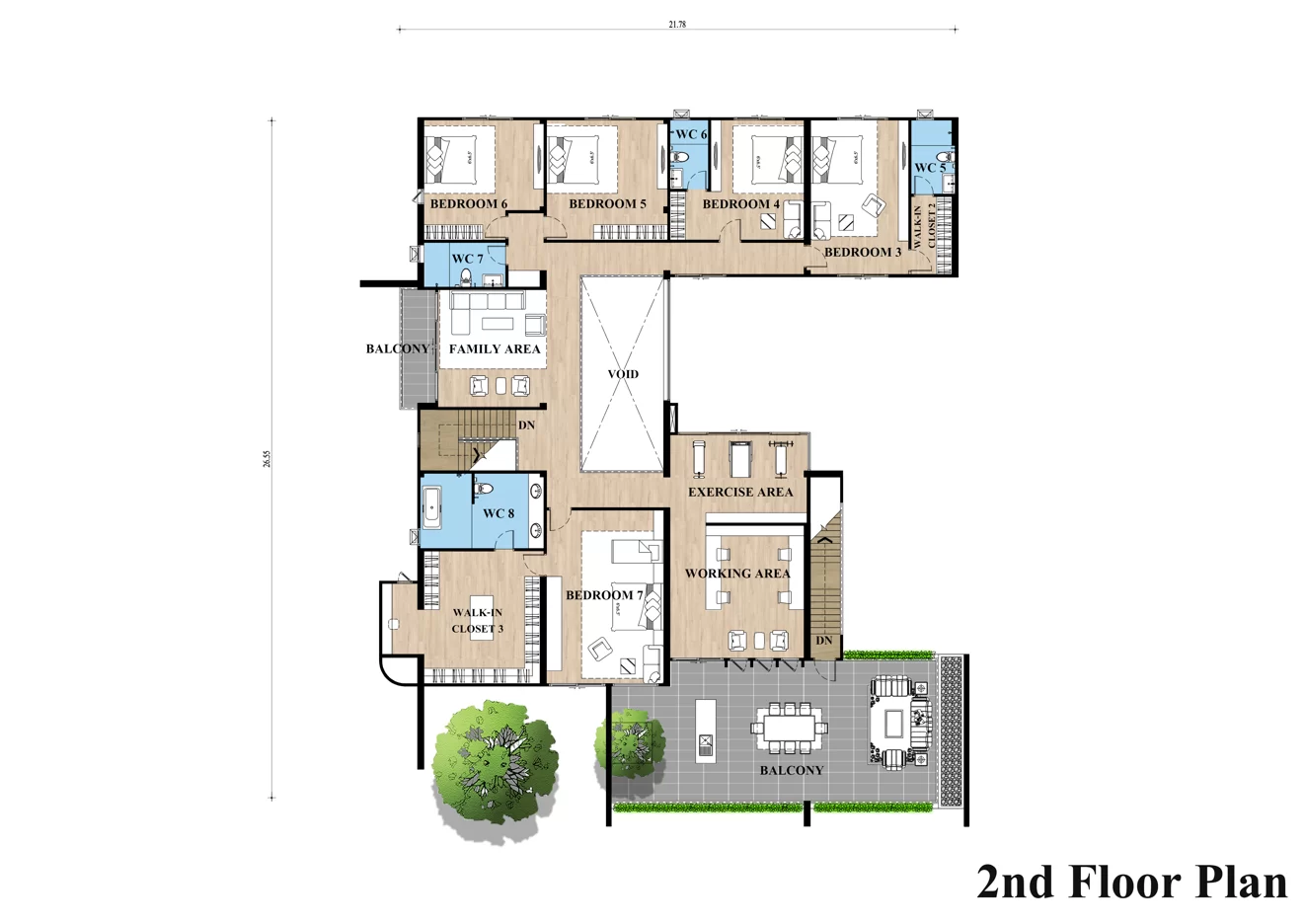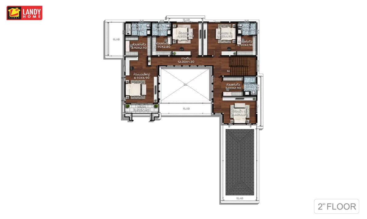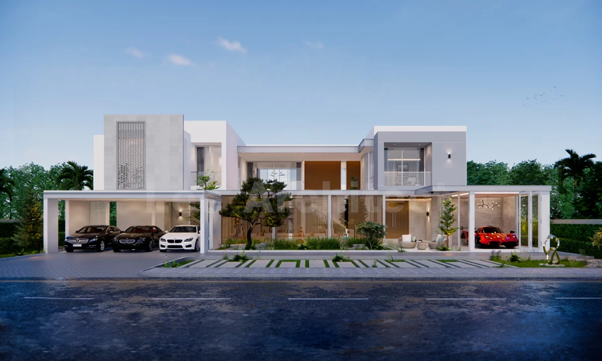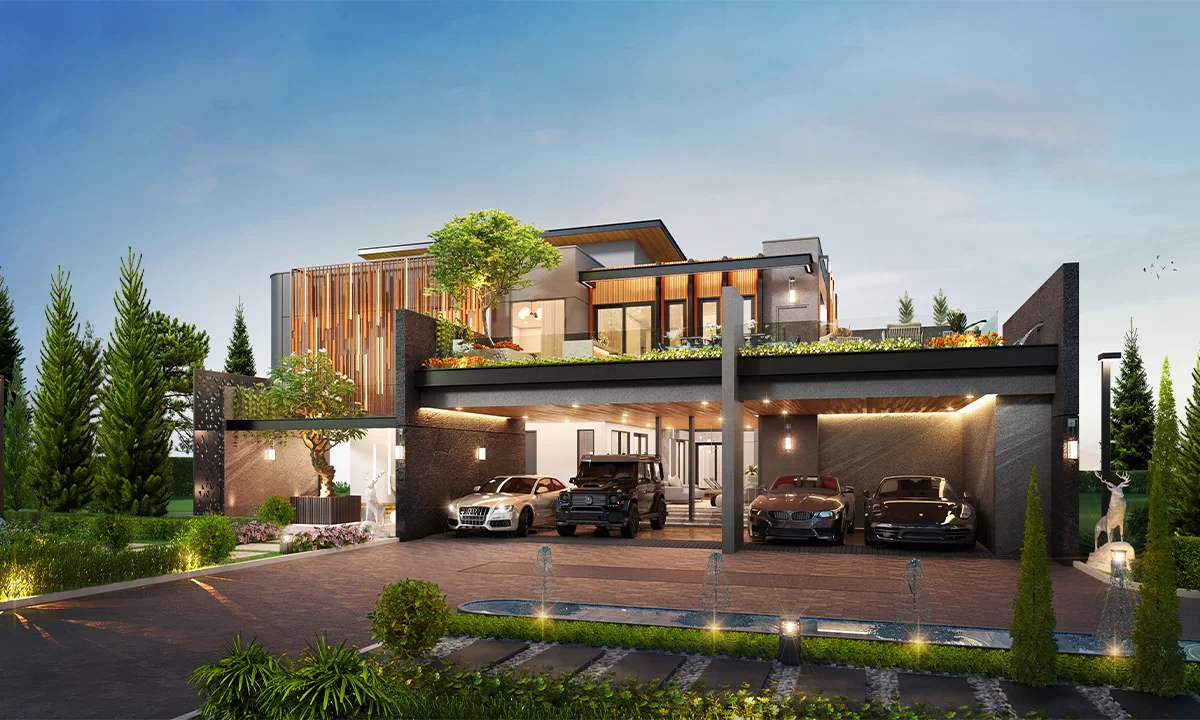 แบบบ้านสไตล์ modern tropical แนวคิดออกแบบที่มีอัตลักษณ์ผสมผสานความทันสมัยและธรรมชาติ ตอบโจทย์ครอบครัวขนาดใหญ่ด้วยพื้นที่ใช้สอยที่ออกแบบมาอย่างพิถีพิถัน การออกแบบมีการเลือกส่วนสีตัวอาคารโดยส่วนที่เน้นสร้างมิติให้อาคาร เราเลือกใช้สีเทคเจอร์และหินวีเนียร์โทนสีเทาและดำ ที่มีผิวสัมผัสเฉพาะตัว เพื่อเพิ่มความเข้มขรึมให้กับตัวอาคาร อีกทั้งยังเลือกใช้วัสดุตกแต่งตัวอาคารที่มีลวดลายคล้ายไม้ ที่เมื่อกระทบกับแสงแดดจะให้ความรู้สึกที่อบอุ่นและผ่อนคลาย รวมถึงการเลือกใช้ ( Facade ) เพื่อเพิ่มความน่าค้นหาให้กับตัวอาคาร เพื่อสะท้อนถึงการตกแต่งที่หรูหราภายในบ้าน ในส่วนของกระจกได้เลือกใช้กระจกที่สูงจรดเพดาน การแบ่งสัดส่วนภายใน มีความโปร่งสบายไม่อึดอัด แต่ยังคงมีความเป็นส่วนตัวของผู้อยู่อาศัย ฟังก์ชันการใช้สอยภายในบ้านที่มีทั้งพื้นที่ส่วนตัวและส่วนกลาง ประกอบด้วย 7 ห้องนอน 8 ห้องน้ำ 4 ห้องอเนกประสงค์ 1 สระว่ายน้ำ และ ระเบียงขนาดใหญ่ บริเวณชั้น 2 ที่รองรับกิจกรรมต่าง ๆ ได้อย่างหลากหลาย เหมาะกับการทำกิจกรรมภายในครอบครัวหรือจะชวนเพื่อน ๆ มาสังสรรค์ในช่วงเทศกาลต่าง ๆ บ้านหลังนี้จึงตอบโจทย์ความต้องการของสมาชิกในครอบครัวทุกช่วงวัย