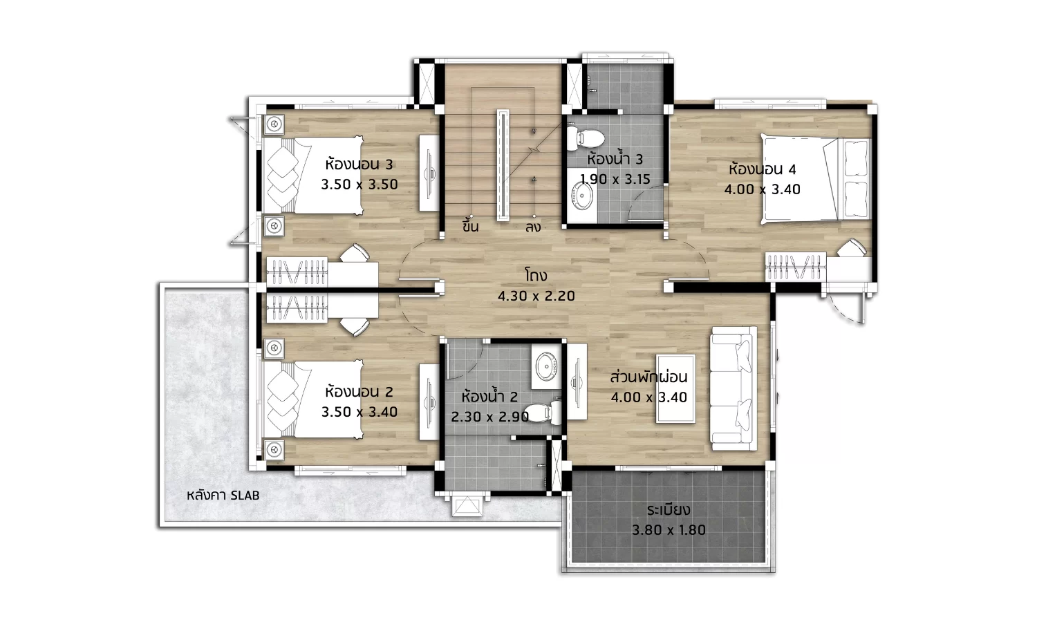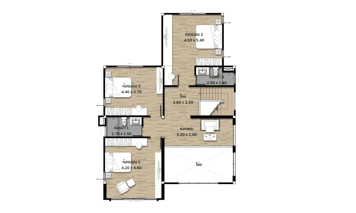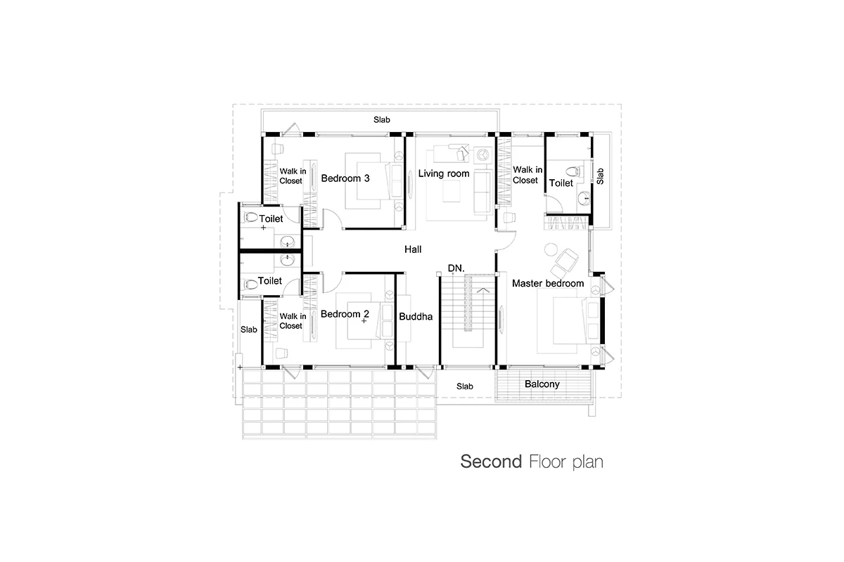 บ้านขนาด 3 ห้องนอน สำหรับครอบครัวสมัยใหม่ที่ต้องการบ้านขนาดกลางเน้นการออกแบบให้บ้านแบ่งออกเป็น 2 ส่วน เพื่อให้การไหลเวียนของอากาศแทรกไปในพื้นที่การพักผ่อนที่แสนสบายในทุกๆมุมของบ้าน โดดเด่นด้วยห้องรับแขกเป็นโถงกระจกบานสูงที่สามารถมองเห็นทัศนียภาพโดยรอบ พร้อมทั้งส่วนพักผ่อนที่ชั้นบนของบ้าน สามารถเปิดรับลมและรองรับกิจกรรมร่วมกันของคนในครอบครัวได้เป็นอย่างดี เป็นบ้านที่มีฟังก์ชั่นที่ครบครันและเหมาะแก่การพักผ่อนอย่างแท้จริง