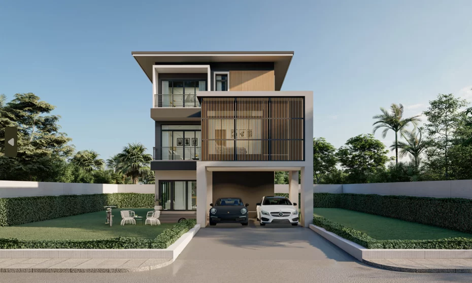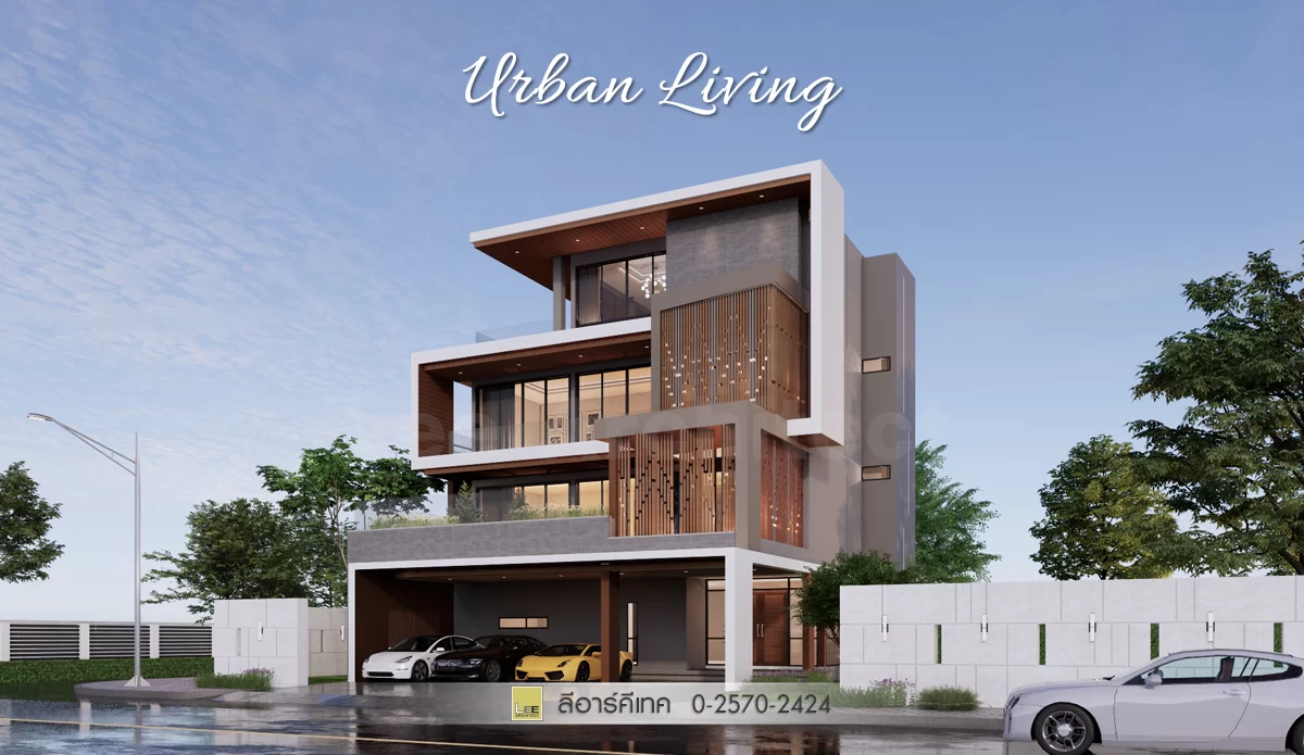 บ้าน 3 ชั้น อยู่สบายด้วยฟังก์ชั่นภายในที่ลงตัว ตอบโจทย์การใช้งานและ รองรับการทำกิจกรรมที่หลากหลาย เหมาะกับการปลูกสร้างในเมืองที่ที่ดินมีขนาดจำกัด รูปลักษณ์ภายนอกทันสมัย เรียบง่าย เสริมความโดดเด่นด้วยระแนงบังตาที่เป็นทั้งวัสดุตกแต่ง ช่วยอำพรางสายตาจากภายนอก และกันแดดได้ในเวลาเดียวกัน