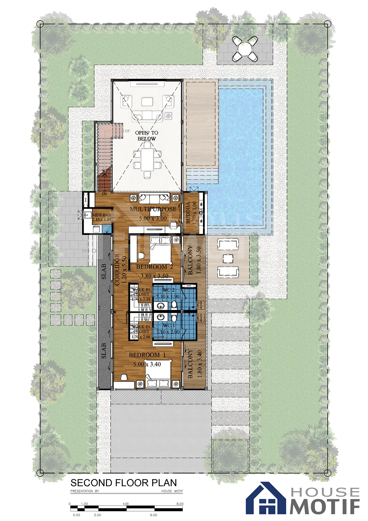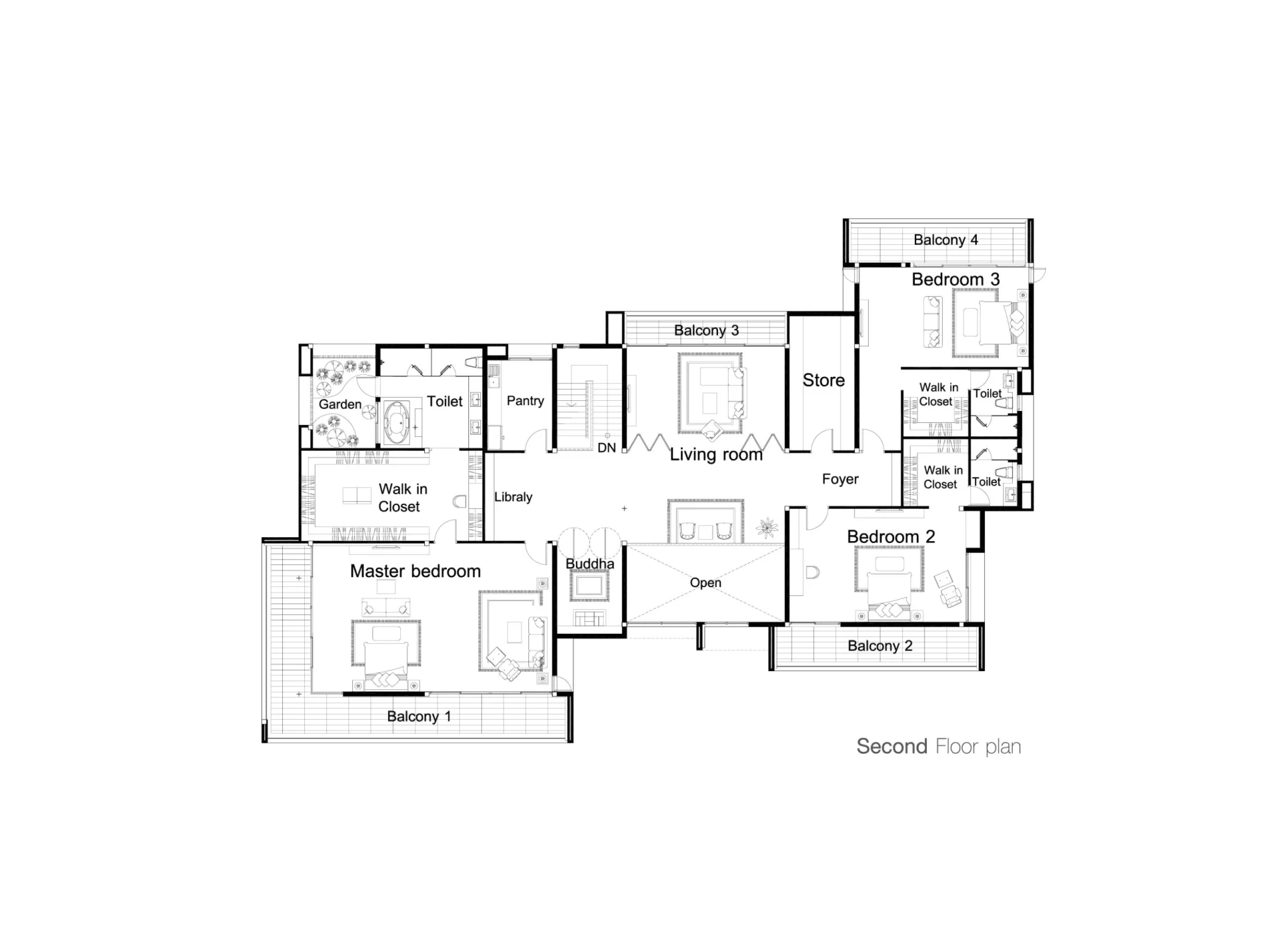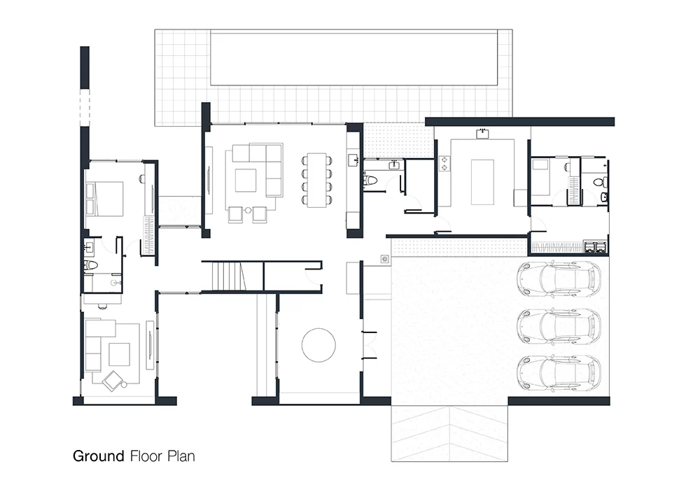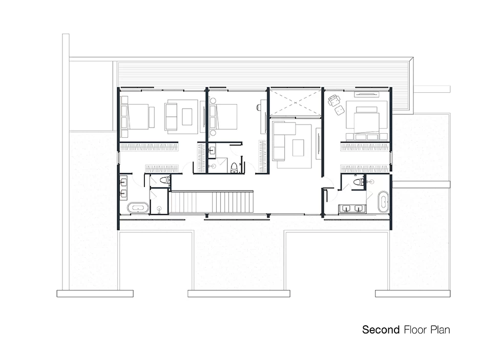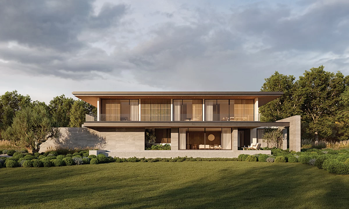 บ้านที่ได้แรงบันดาลใจมาจาก Resort & Spa! เน้นคอนเซ็ปต์ของการจัดสัดส่วนอย่างลงตัวระหว่างการพักผ่อนและการทำกิจกรรม สะท้อนการดีไซน์แบบ function to Form ของอาคาร ที่ตอบโจทย์ทั้งการใช้ชีวิตและสุนทรียภาพของสถาปัตยกรรม โดยบ้านหลังนี้ออกแบบส่วนตรงกลางเป็น Courtyard เปิดโล่ง รูปตัว U เป็นพื้นที่สระว่ายน้ำและเฉลียงขนาดใหญ่เป็นจุดพักผ่อนหลักของบ้าน ที่สามารถเชื่อมต่อพื้น Flow of Space) ไปยัง Dining และ Living area ได้ และมีส่วนของ Salon & Gym ที่มองออกมาเห็นวิวสระว่ายน้ำและสวนกลางบ้านเพิ่มความผ่อนคลาย และเชื่อมต่อพื้นที่ชั้นสองด้วยโถงสูงเปิดโล่งและบันไดทอดยาวไปยังห้องพักผ่อนส่วนกลางของครอบครัว ก่อนจะนำทางไปยังห้องนอนส่วนตัวของแต่ละคน ฟอร์มของอาคารใช้การคว้านและยื่นตัวกล่องอาคารเพื่อการเว้นจังหวะของสัดส่วนอาคาร และใช้ Facade อิฐบล็อกเรียงตัวสลับกันเป็นการบดบังสายตาและเปิดมุมมองส่วนระเบียง และระแนงไม้ที่ยาวบดบังทางเดินและส่วนกลางของบ้าน เพิ่มความเป็นส่วนตัวมากขึ้นด้วยการจัดสวนหน้าบ้าน ทั้งยังได้ลมเย็นเข้าสูตัวอาคารอีกด้วย