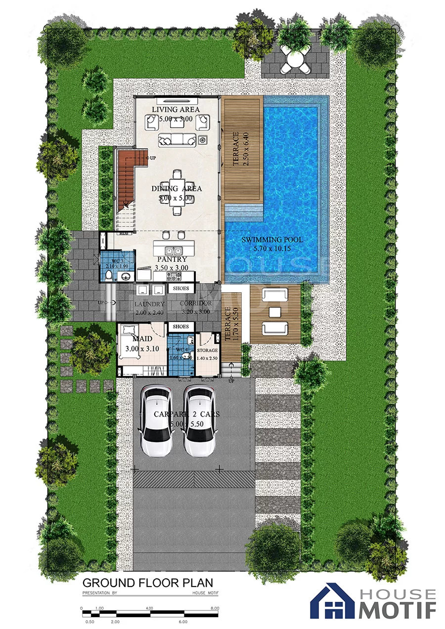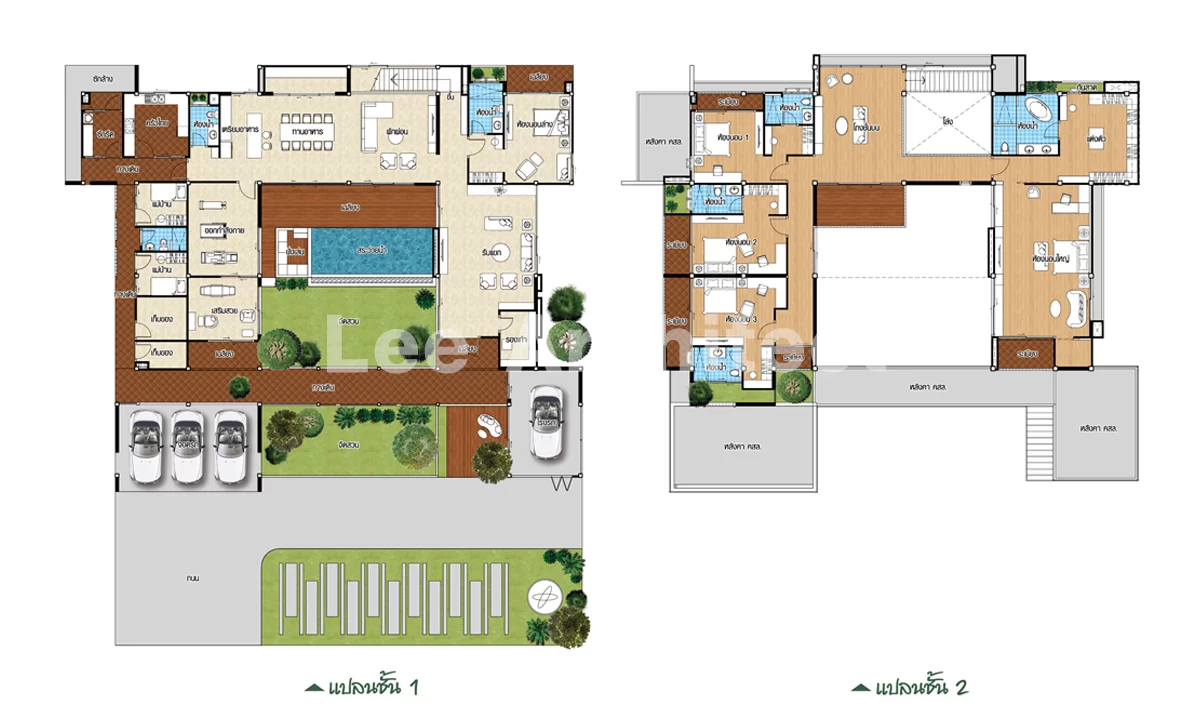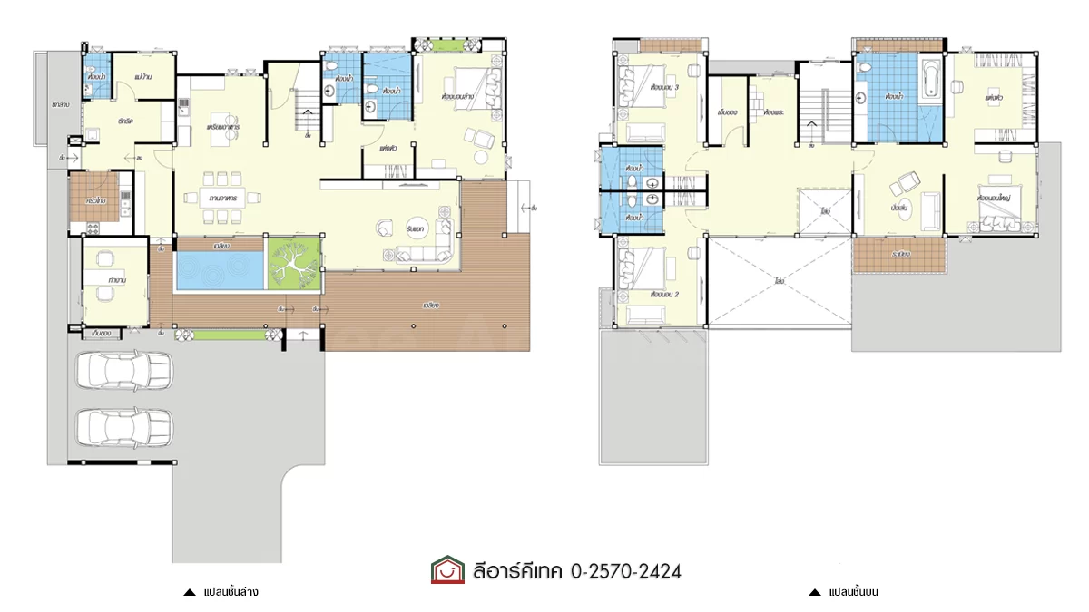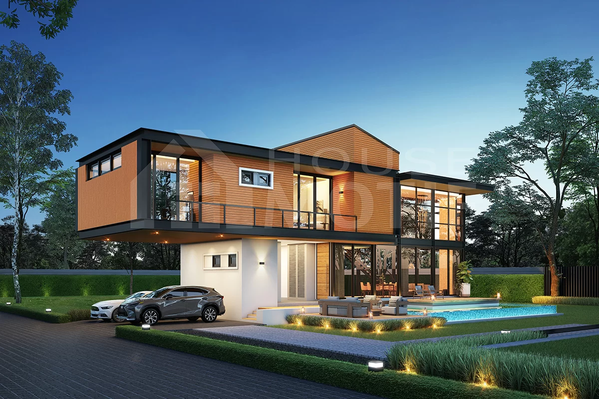 แบบบ้านสไตล์ Modern Luxury ส่วนประกอบของบ้าน ได้แก่ บ้าน 2 ชั้น 2 ห้องนอน 3 ห้องน้ำ จอดรถ 2 คัน สระว่ายน้ำ และส่วนบริการ