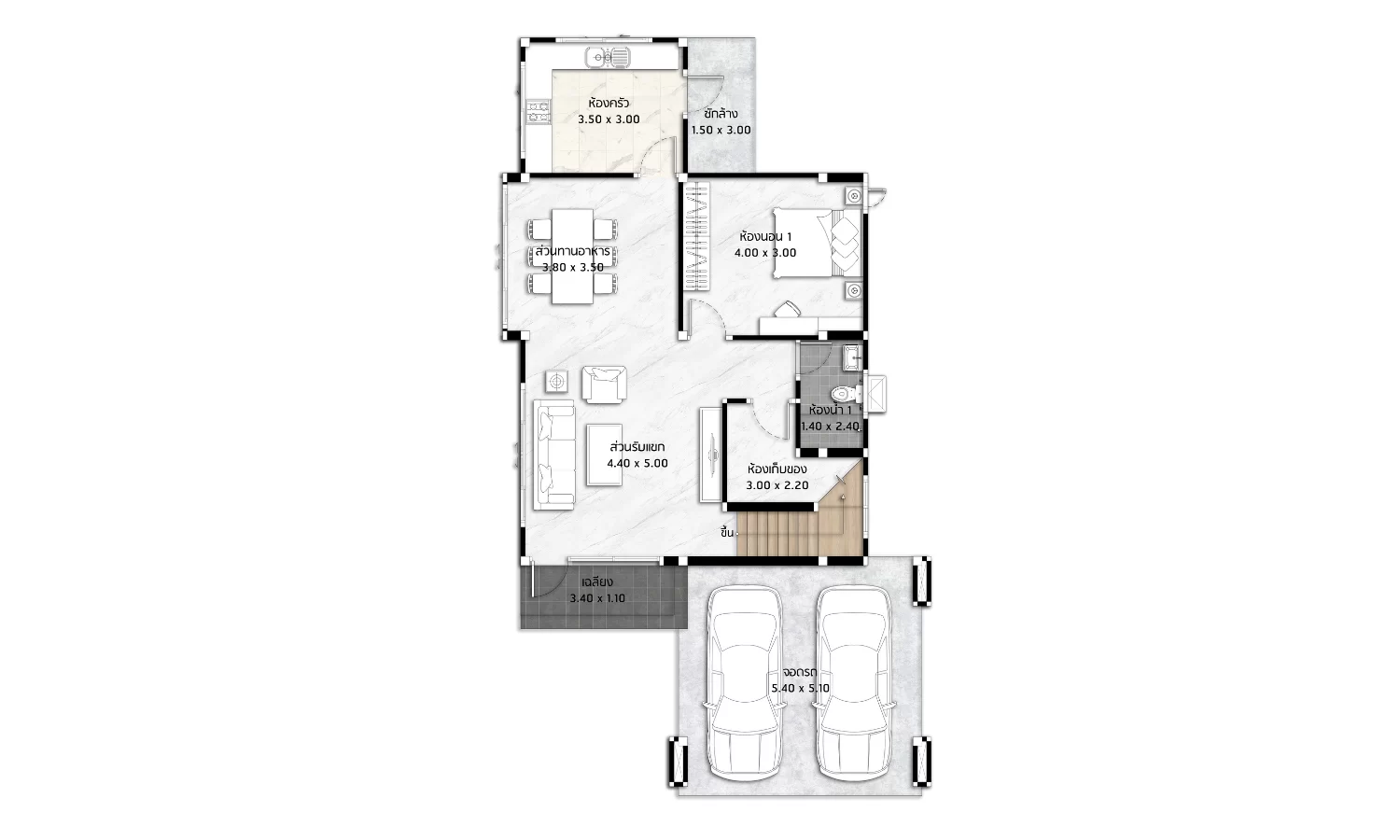บ้านสไตล์โมเดิร์น 2 ชั้น ตอบสนองไลฟ์สไตล์ชีวิตสมัยใหม่ ด้วยส่วนพักผ่อนเชื่อมต่อกับส่วนรับประทานอาหารเพื่อให้ได้พื้นที่เปิดโล่งขนาดใหญ่สามารถที่จะปรับเปลี่ยนการใช้งานพื้นที่ได้อเนกประสงค์ยิ่งขึ้น ภายในให้ความรู้สึกโปร่งสบายด้วยกระจกบานสูงและเพดานสูง พร้อมด้วยการจัดสรรพื้นที่สำหรับห้องนอนขนาดใหญ่ 2 ห้อง และห้องพักแขกชั้นล่าง 1 ห้อง