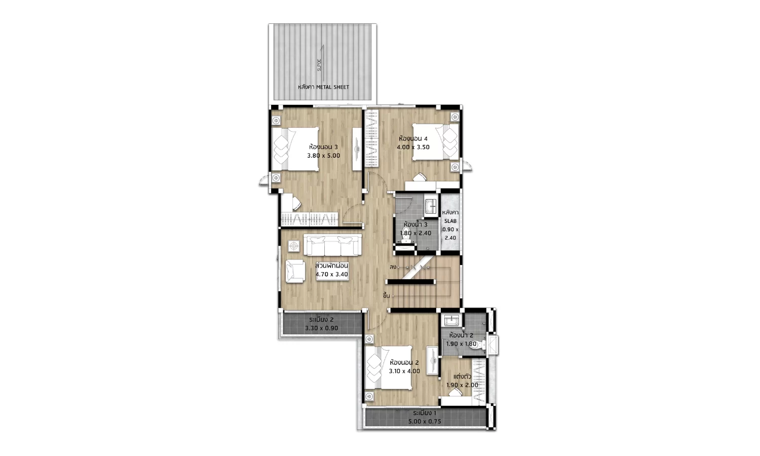 บ้านสไตล์ Modern ที่ถูกออกแบบด้วยความเรียบง่าย ทันสมัย ภายในชั้นล่างจัดสรรพื้นที่ใช้สอยเป็นสัดส่วน และต่อเนื่องยาวตลอดเพื่อความโปร่ง โล่ง สบาย ชั้นบนประกอบด้วย 3ห้องนอน โดยห้องนอน Masterนั้นกว้างขวางเป็นพิเศษ และมีห้องพักผ่อนเพื่อกิจกรรมของครอบครัวอีกด้วย