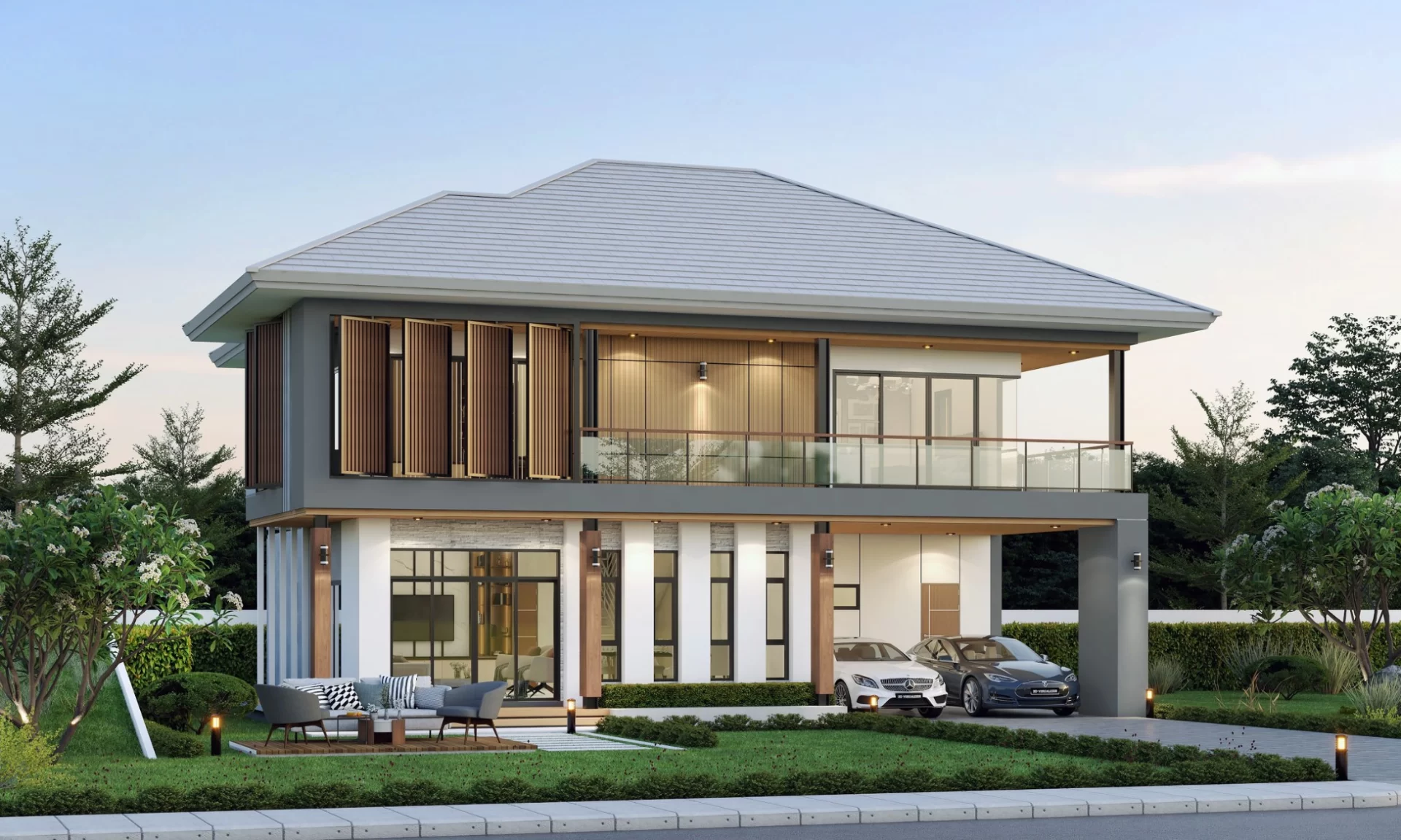 พิมมุกดา บ้านที่สะท้อนเอกลักษณ์ของการออกแบบสไตล์ Modern tropical elegance ด้วยวัสดุตกแต่งอลูมีเนียมลายไม้ที่เพิ่มความอบอุ่นและมีสเน่ห์ ผสานการออกแบบพื้นที่ใช้สอย 297 ตร.ม อย่างชาญฉลาด รองรับทุกฟังก์ชั่นสำหรับครอบครัว พร้อมดีไซน์ที่สะท้อนความหรูหราและรสนิยมอันเหนือระดับ