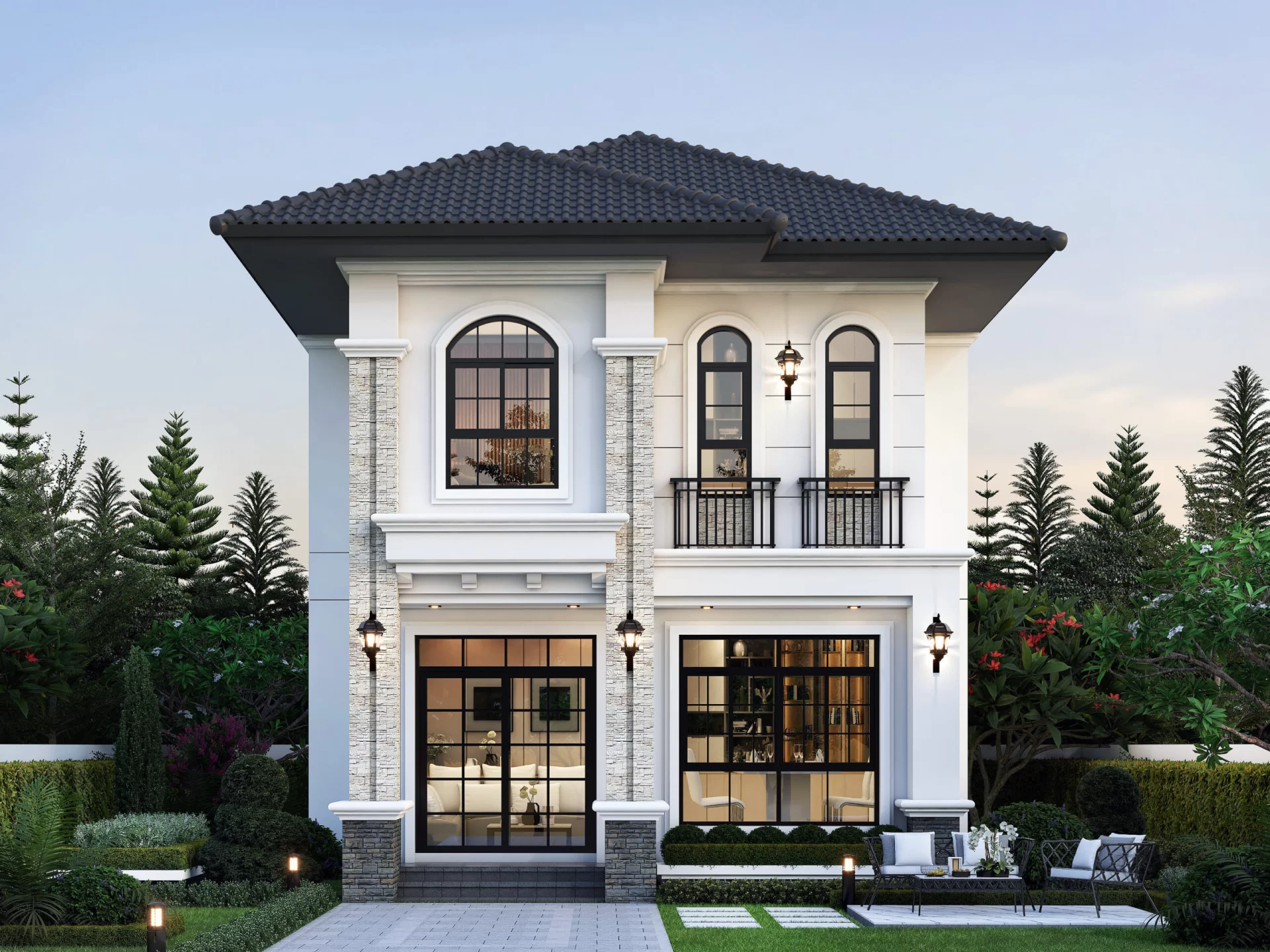 แบบบ้านพิมเพทาย เป็นบ้านที่ออกแบบในสไตล์ คลาสสิกโมเดิร์น (Classic Modern) ซึ่งเน้นการออกแบบที่ผสมผสานระหว่างความสง่างามในแบบดั้งเดิมและฟังก์ชันที่ทันสมัย เพื่อสร้างบ้านที่ให้บรรยากาศอบอุ่น ดูหรูหรา แต่เรียบง่าย เหมาะสำหรับครอบครัวขนาดกลางที่ต้องการบ้านที่ดูแลรักษาง่ายและครบครันในทุกฟังก์ชันการใช้งาน จุดเด่นของแบบบ้านพิมเพทาย 1. ดีไซน์คลาสสิกที่ทันสมัย การใช้ซุ้มโค้งเหนือหน้าต่างและประตู ช่วยเพิ่มความโดดเด่นและคลาสสิกในงานออกแบบ โทนสีขาวและเทาพร้อมวัสดุตกแต่งลายหิน สร้างความหรูหราที่เรียบง่าย 2. พื้นที่ใช้สอยกระทัดรัด แต่ครบฟังก์ชัน พื้นที่ 158 ตารางเมตร ถูกจัดสรรอย่างชาญฉลาด รองรับความต้องการของครอบครัวขนาดกลางได้อย่างลงตัว มี 4 ห้องนอน และ 3 ห้องน้ำ ตอบโจทย์ทั้งพื้นที่ส่วนตัวและพื้นที่ส่วนกลาง 3. เหมาะสำหรับครอบครัวที่มีรถส่วนตัว มีพื้นที่สำหรับจอดรถในตัวบ้าน ทำให้สะดวกสบายสำหรับการใช้งานประจำวัน 4. การออกแบบเน้นความโปร่งโล่งและสว่าง หน้าต่างขนาดใหญ่ช่วยเพิ่มแสงธรรมชาติและเชื่อมต่อพื้นที่ภายในกับพื้นที่สีเขียวภายนอก บริเวณสวนรอบบ้านเพิ่มบรรยากาศสดชื่นและพื้นที่พักผ่อน