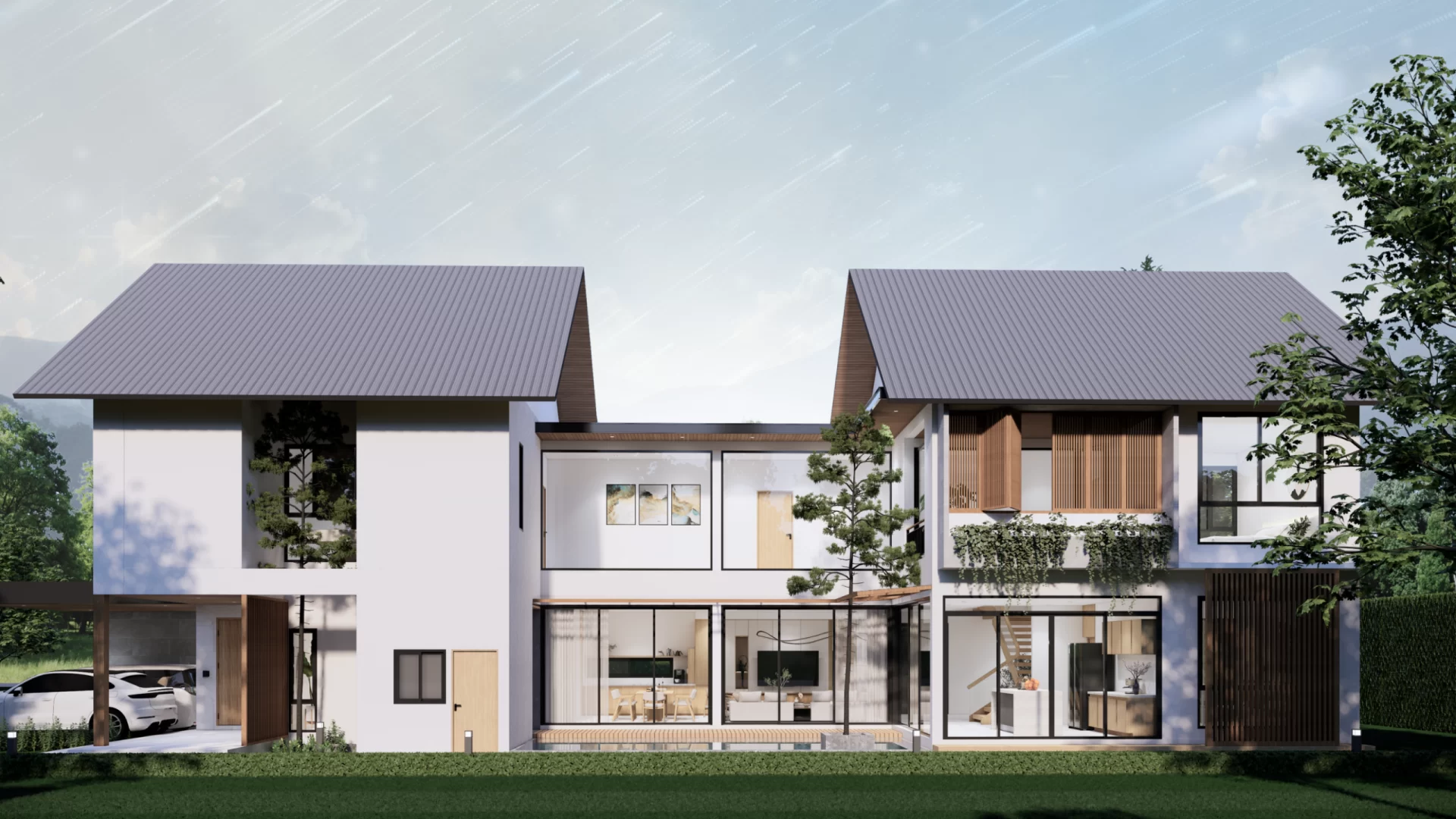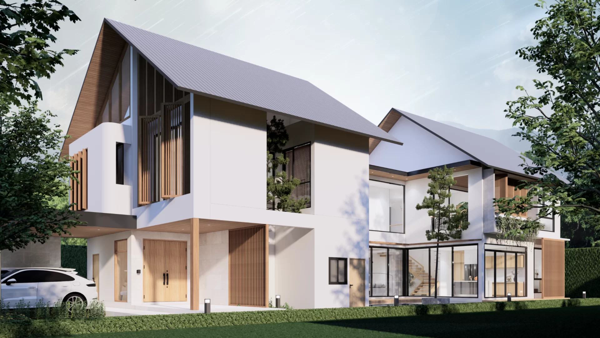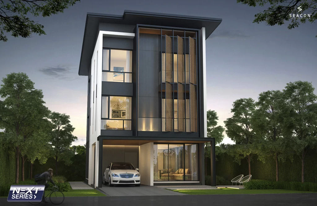 ตัวบ้านถูกออกแบบในสไตล์ Modern Contemporary ที่เน้นความทันสมัย เรียบง่าย เพิ่มมิติที่น่าสนใจด้วยระแนงไม้เลื่อน ช่วยบดบังสายตาจากผู้คนภายนอกเน้นให้ความสำคัญกับพื้นที่ส่วนตัวของครอบครัว เหมาะกับครอบครัวขนาดใหญ่