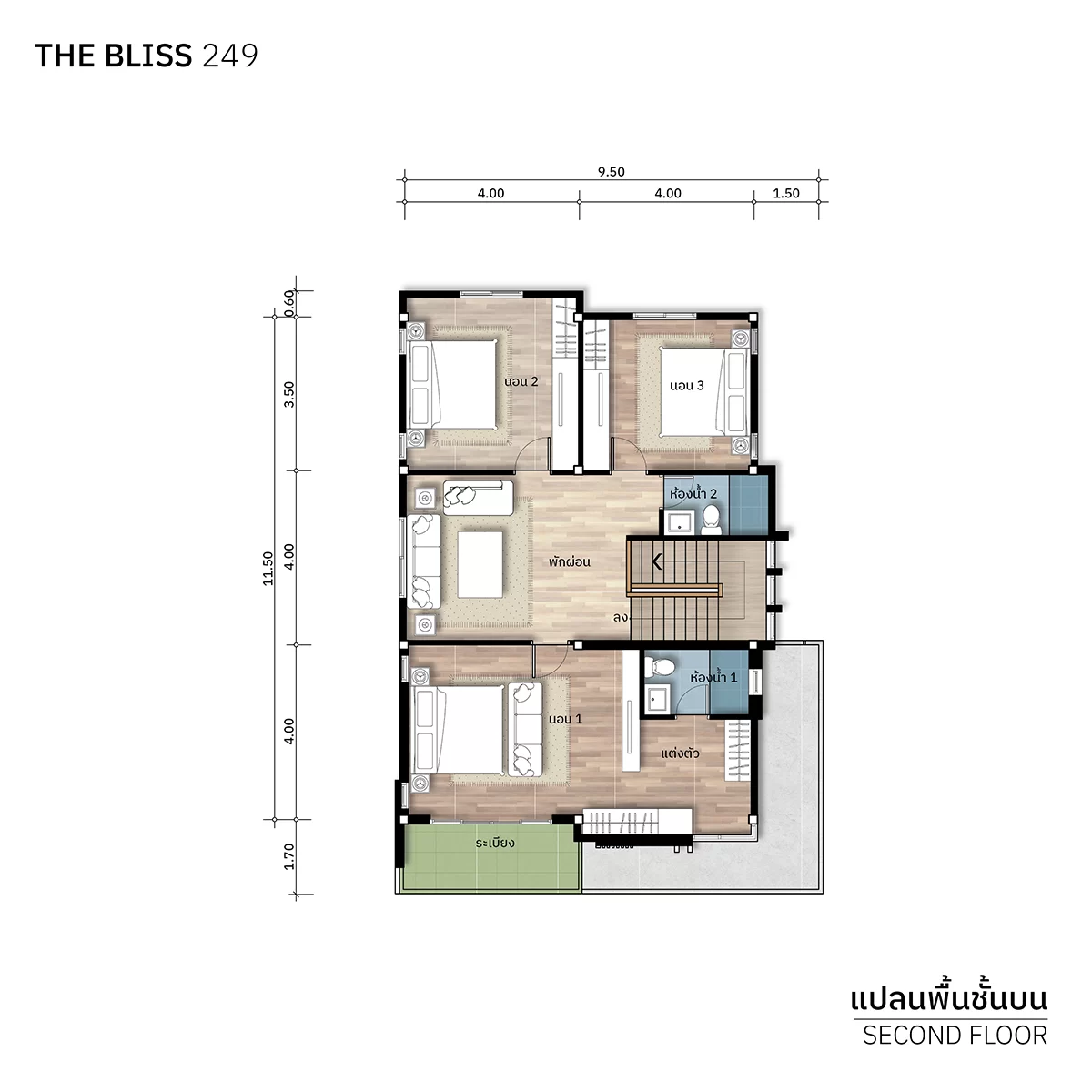 ด้วยแนวคิดการออกแบบให้เป็นทรงสี่เหลี่ยม (Box) มีรูปทรงที่ชัดเจน การจัดวางฟังก์ชันเรียบหรูสไตล์ Modern สะดวกต่อการใช้งาน เพิ่มความโปร่งโล่งให้ภายในบ้านด้วยกระจกสูง ด้านหน้าออกแบบโดยการใช้ระแนงทำให้เกิดมุมมองที่โดดเด่นน่าสนใจ ชั้นล่าง เพิ่มความโดดเด่นด้วยการมีทางเข้าได้ 2 ทาง ภายนอกมีเฉลียงด้านข้างทำให้เกิดมุมมองที่สวยงาม ภายในบ้านกว้างขวางด้วยการมีโถงโล่ง 2 ชั้นสู่โถงชั้นบน (Double Volume) มีห้องนอนชั้นล่างเพื่อรองรับผู้สูงอายุ หรือรับแขก ชั้นบน มีลักษณะโดดเด่นตรงมีโถงกว้างขวางดูโปร่ง ห้องนอน 3 ห้องนอน แบ่งเป็นสัดส่วน
